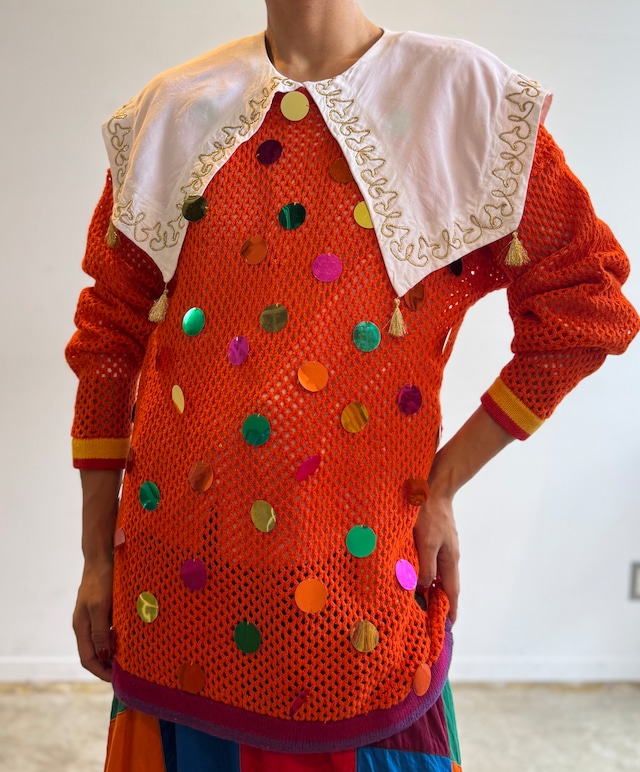 記載サイズ M 肩幅 - 身幅 60cm 着丈 72cm 素材 ラミー・コットン フロントには大ぶりのスパンコールがあしらわれた古着ならではなアイテム。 着丈も長めでお尻に掛かるぐらい 荒目のコットンニットなのでロングシーズン着用頂けます。 特筆するダメージはありません。 ※表記サイズは平置き採寸です。手作業での採寸の為、多少のずれが生じることもございます。 ※こちらの商品は店頭でも販売しているため、同時に売れてしまう可能性がございます。 そのような場合、ご注文をキャンセルさせていただくことがございます。 あらかじめご了承ください。 ※こちらの商品はUSEDです。 そのため使用感や経年の劣化はございます。 特に気になるコンディションにつきましては明記してありますが、あくまでも弊店の基準でご案内させて頂いております。 Vintage,USED商品にご理解のある方のみでお願いいたします。 ※商品の色味は、できる限り肉眼に近いように調整しておりますが、お手元のブラウザによって見え方がかわることもあります。 以上の理由での返品は承っておりませんので ご理解いただけた方のみご注文いただけますようお願い申し上げます。 商品に関するご質問等あれば、お気軽にお問い合わせ下さい。