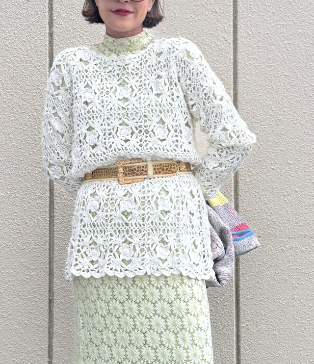 記載サイズ - 肩幅 - 身幅 60cm 着丈 72cm 素材 表記なし(恐らくコットン製です) お花モチーフのクロシェニットトップス 着丈も長めで色々なレイヤードが楽しめそうな一枚。 数箇所(特に左袖辺り)に黄色い色移りが見受けられます(画像参照) 特筆するダメージはありません。 ※表記サイズは平置き採寸です。手作業での採寸の為、多少のずれが生じることもございます。 ※こちらの商品は店頭でも販売しているため、同時に売れてしまう可能性がございます。 そのような場合、ご注文をキャンセルさせていただくことがございます。 あらかじめご了承ください。 ※こちらの商品はUSEDです。 そのため使用感や経年の劣化はございます。 特に気になるコンディションにつきましては明記してありますが、あくまでも弊店の基準でご案内させて頂いております。 Vintage,USED商品にご理解のある方のみでお願いいたします。 ※商品の色味は、できる限り肉眼に近いように調整しておりますが、お手元のブラウザによって見え方がかわることもあります。 以上の理由での返品は承っておりませんので ご理解いただけた方のみご注文いただけますようお願い申し上げます。 商品に関するご質問等あれば、お気軽にお問い合わせ下さい。