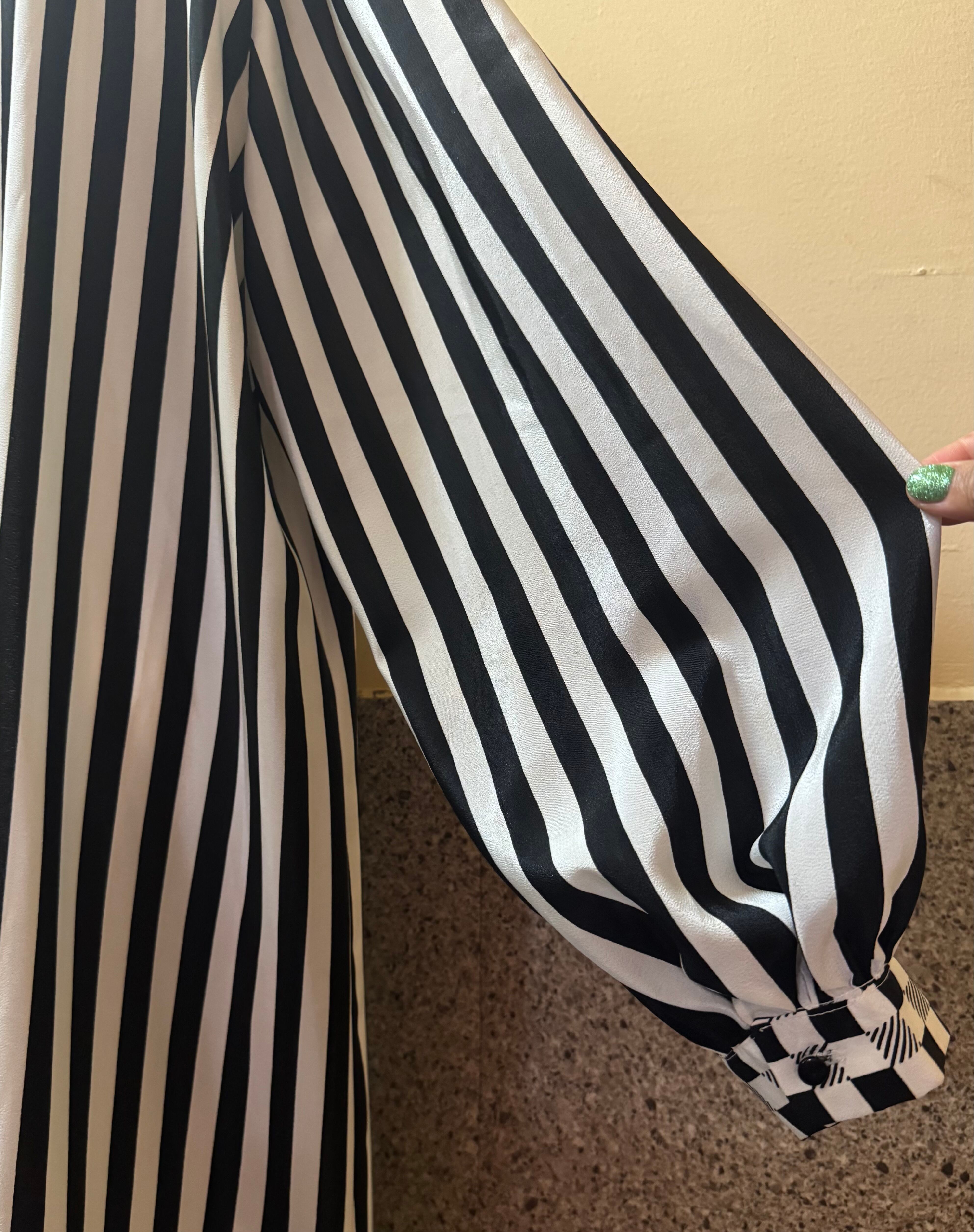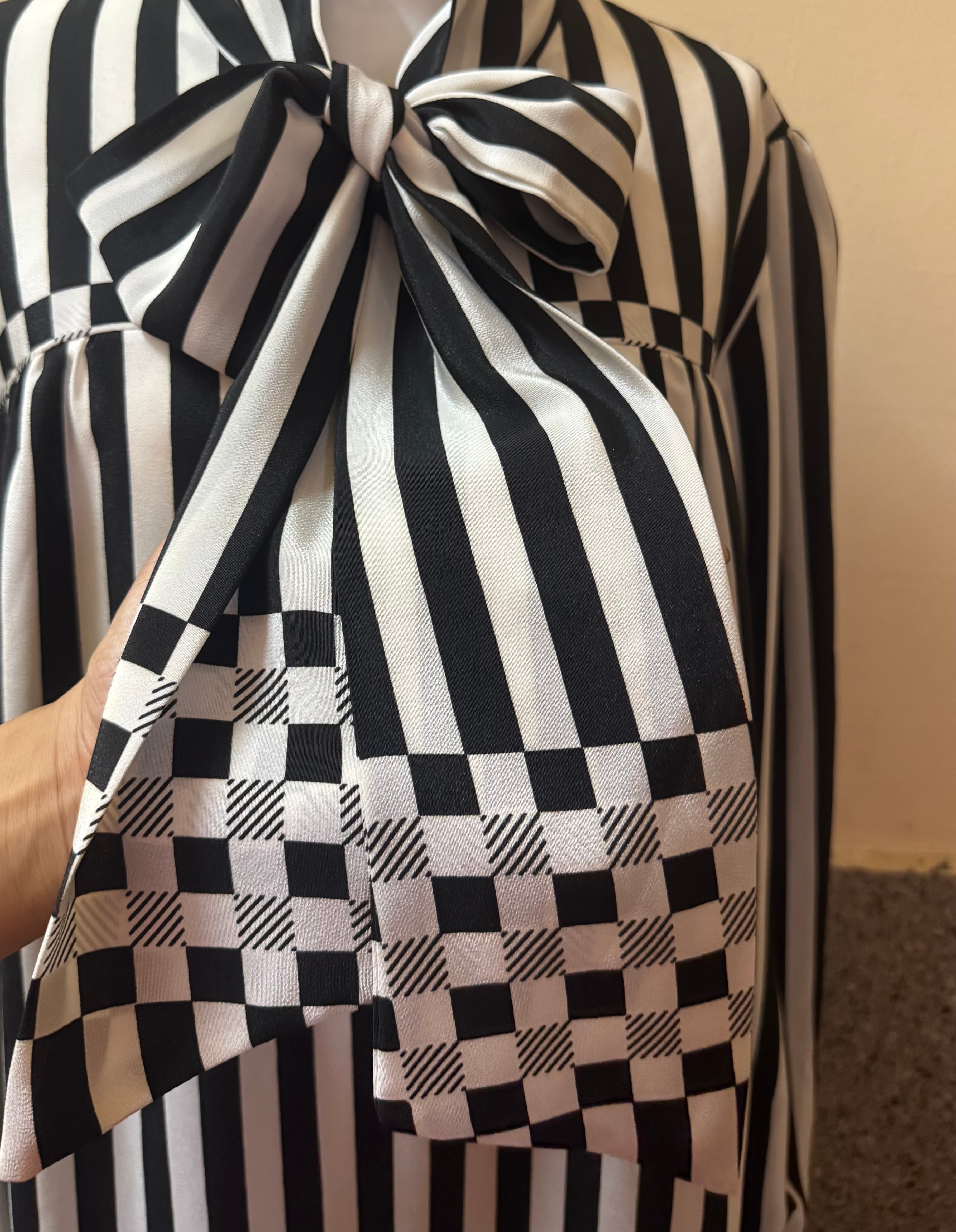 長めのリボンタイが付いており、前で結んでも後ろに垂らしても◎