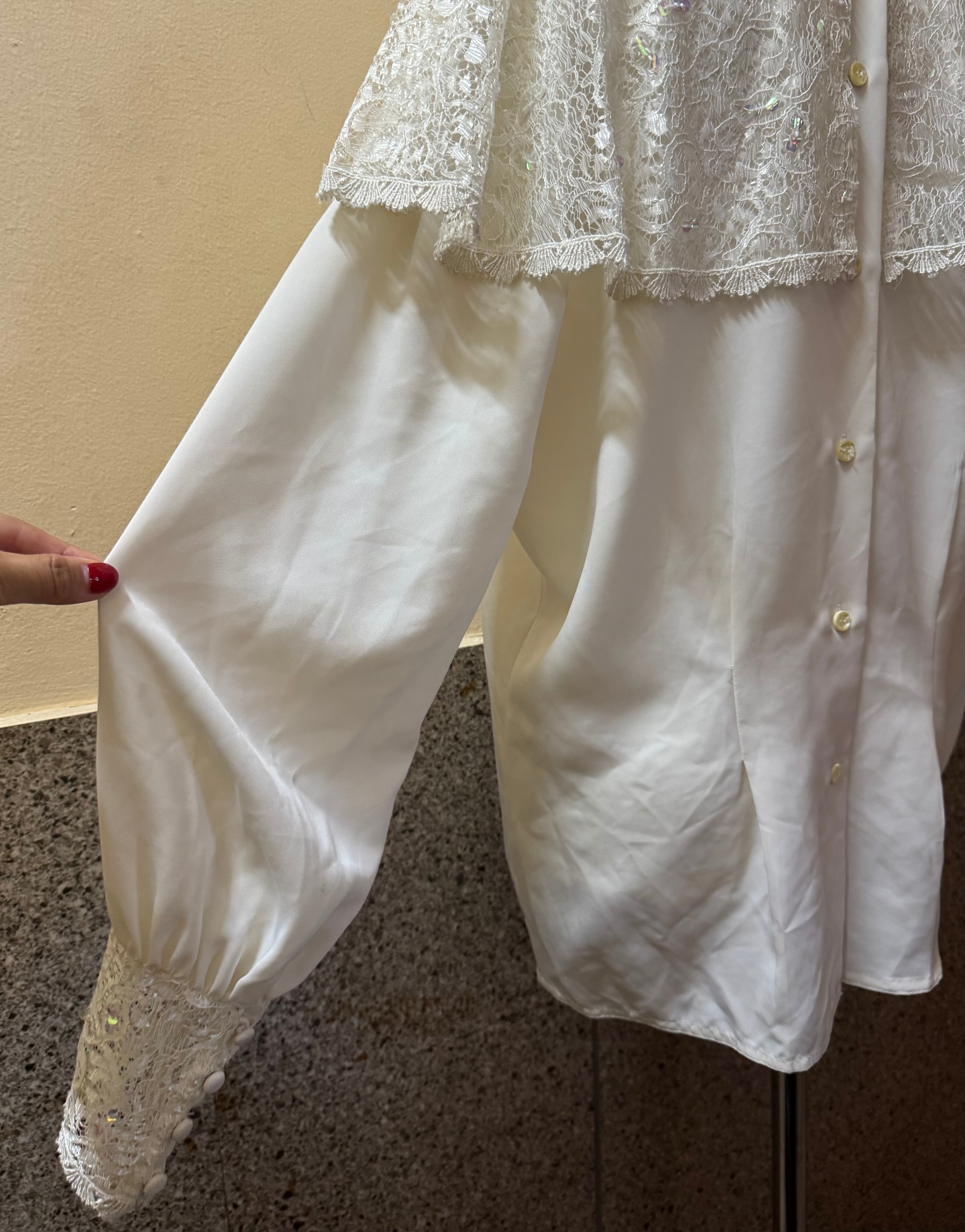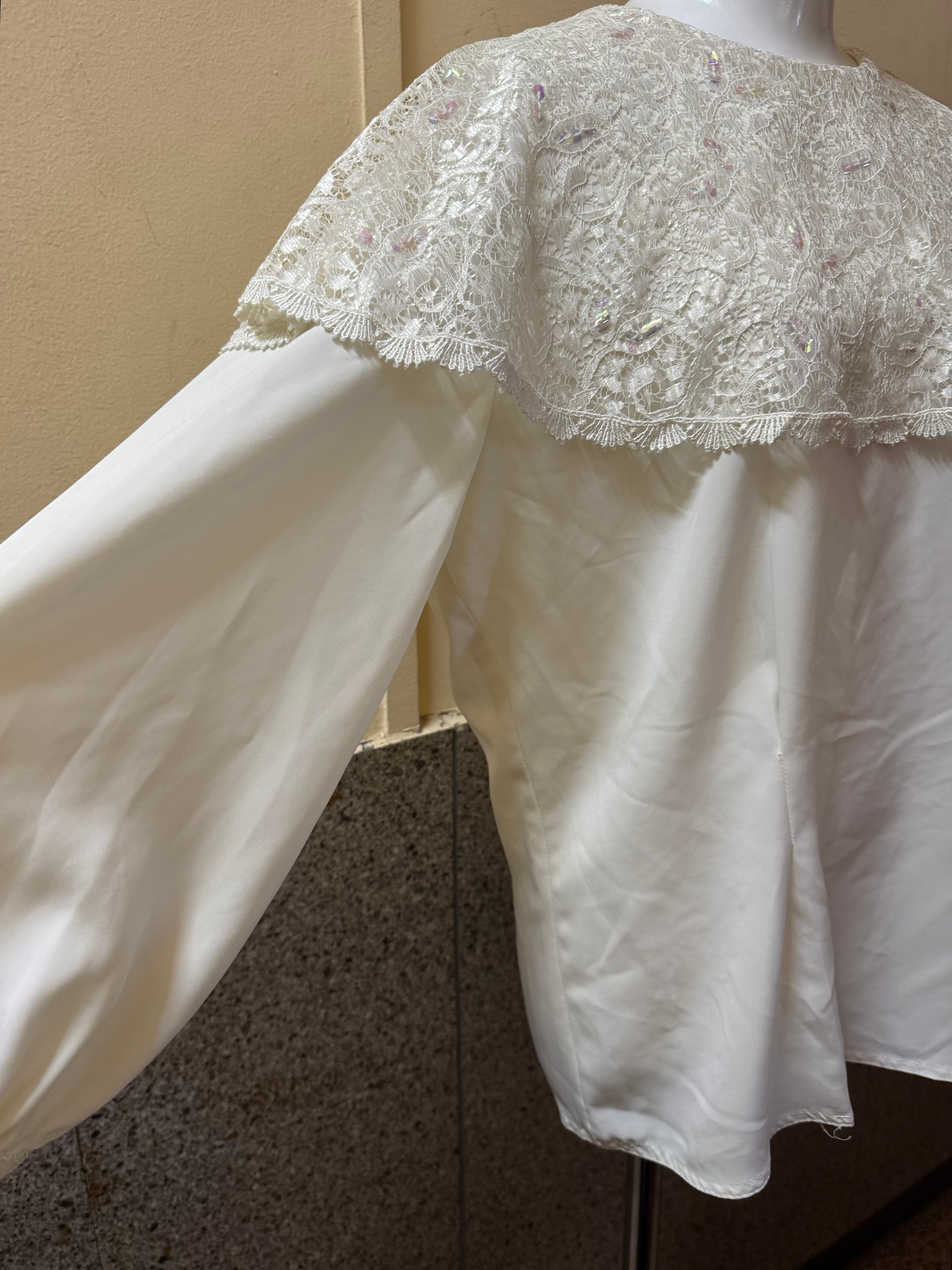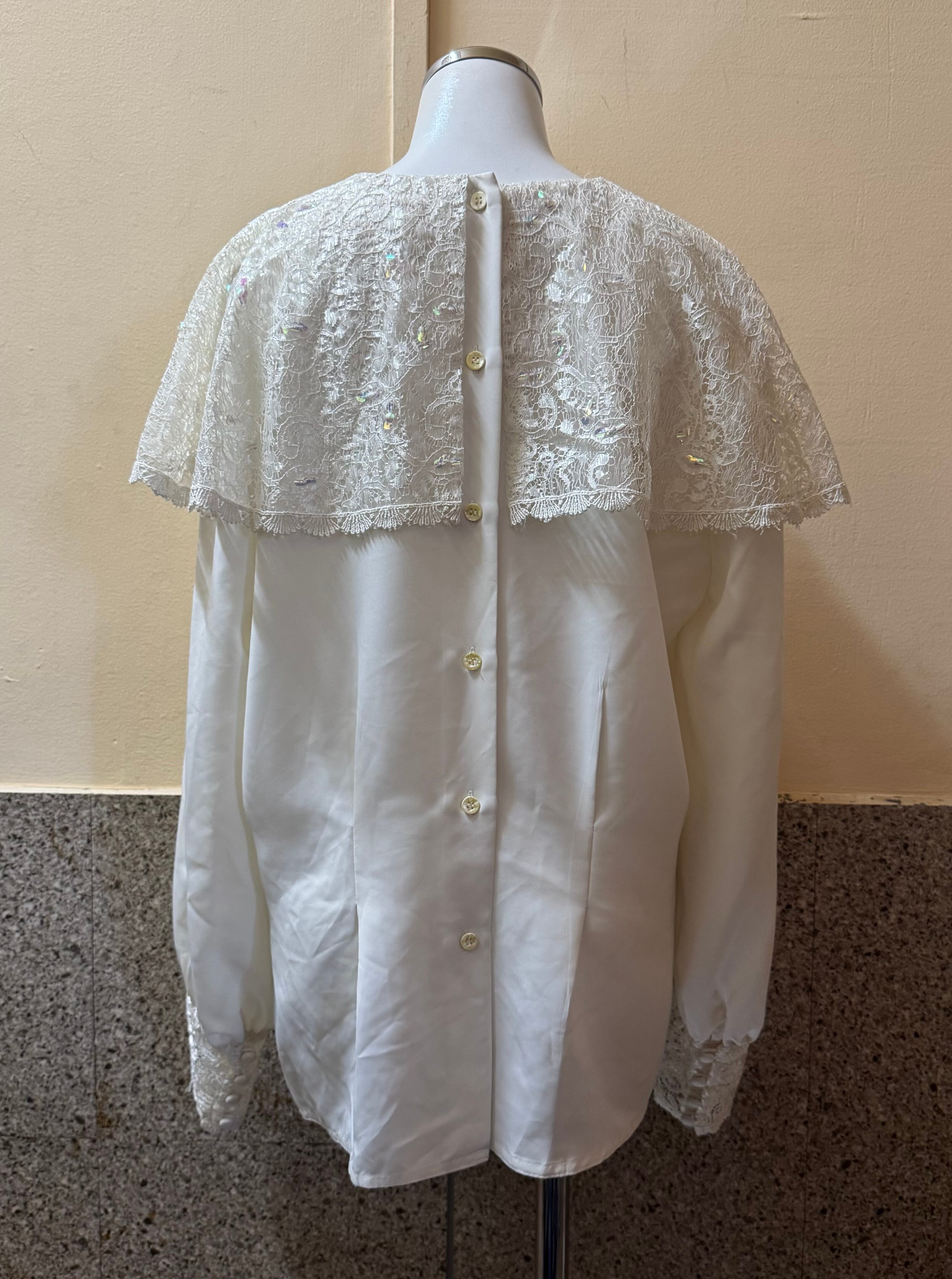 スウェットやニット、カーディガンから襟と袖口を出して楽しみたい1枚です。
