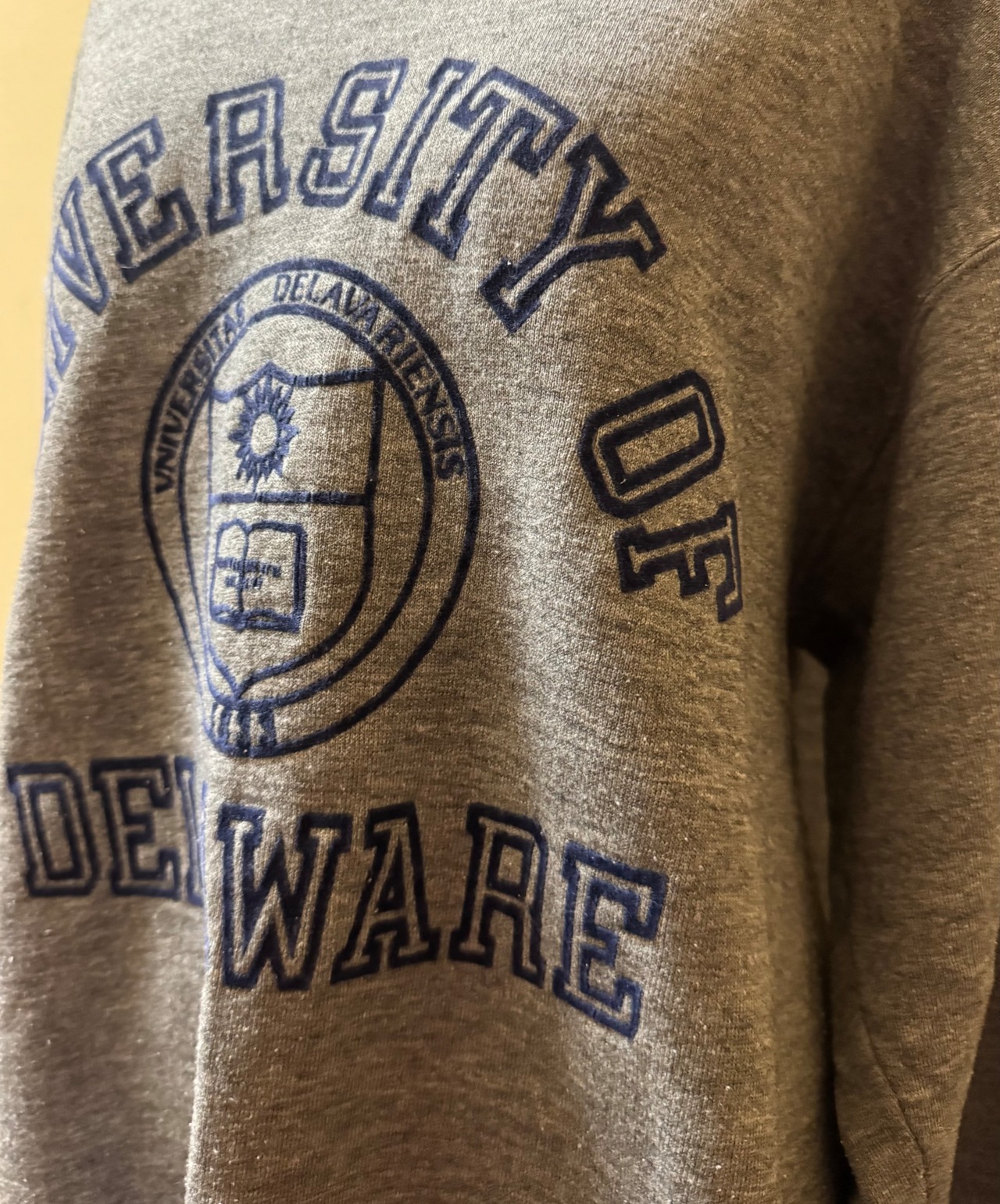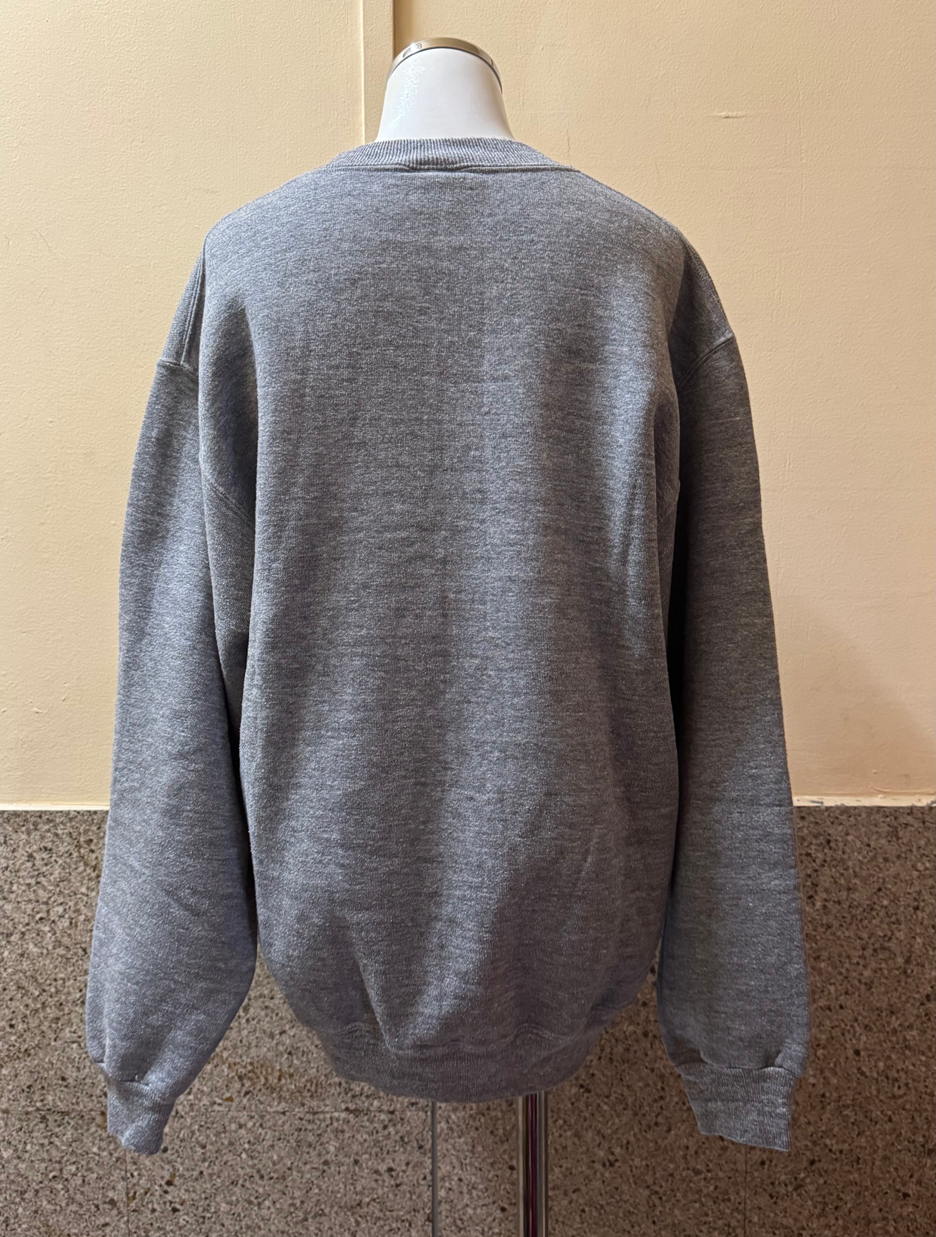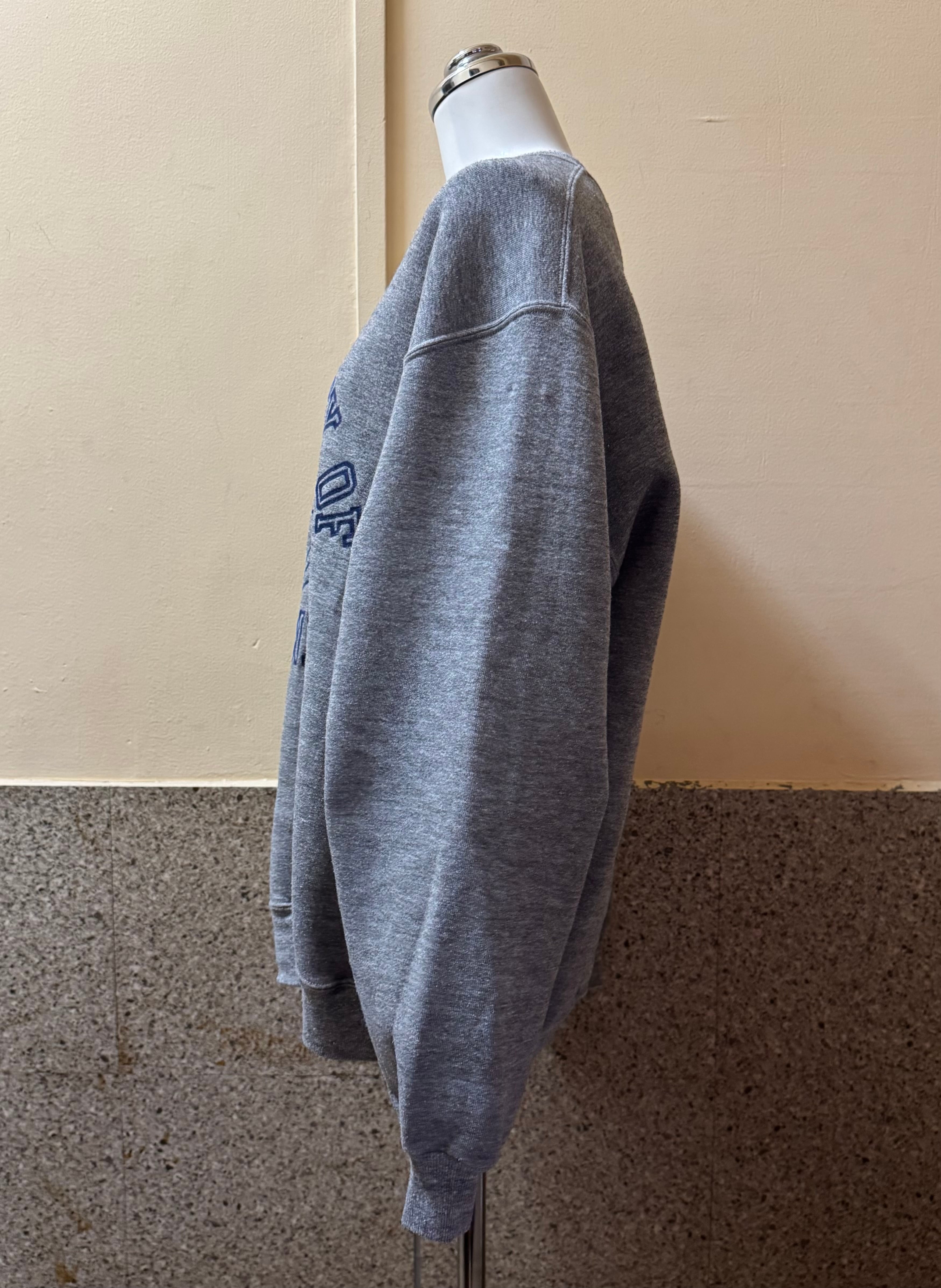 なんだかんだ合わせやすいグレーにネイビーのプリントのカレッジスウェット
