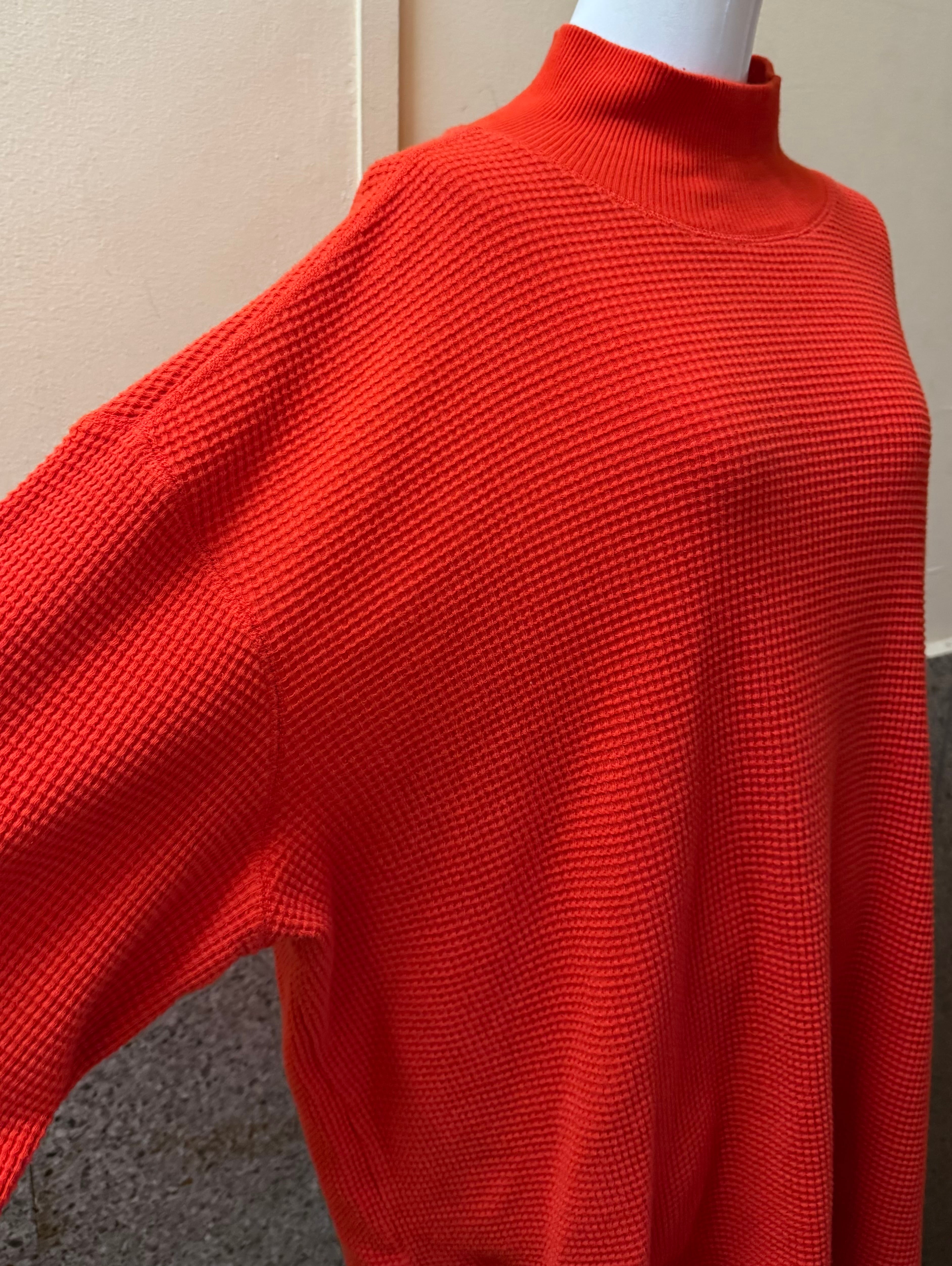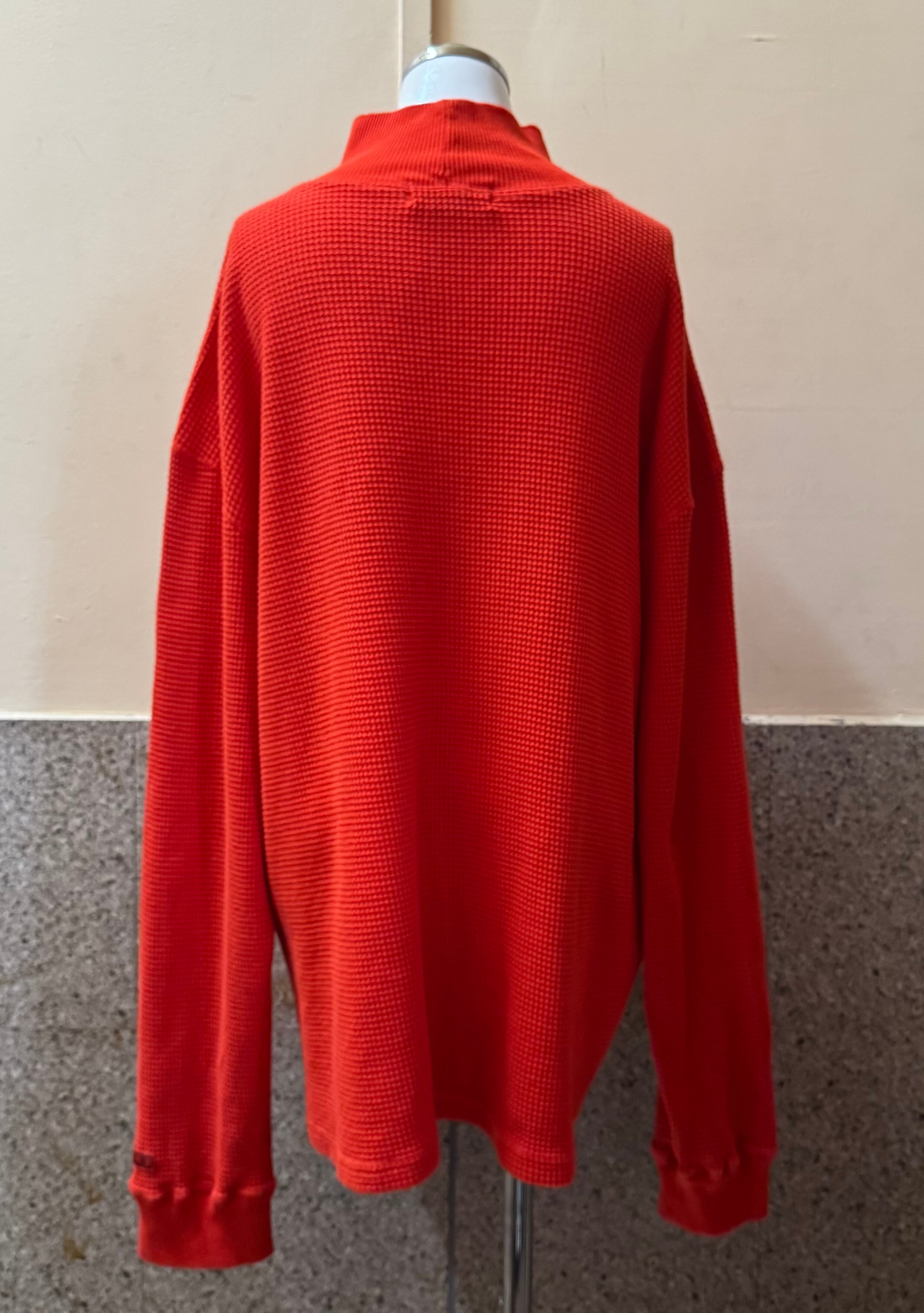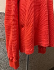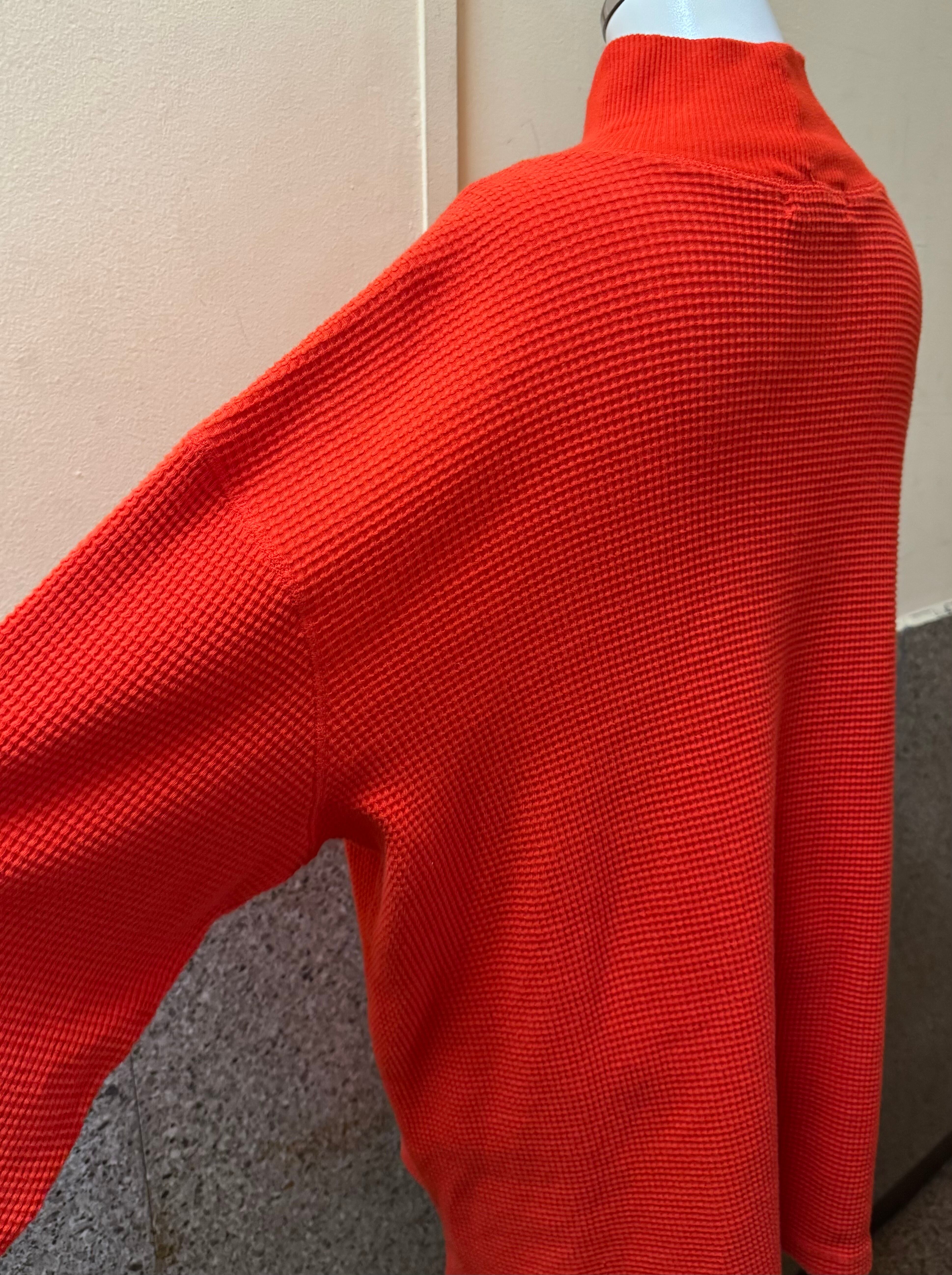 朱赤の様な色味が秋冬のスタイリングの差し色にピッタリな一枚です。