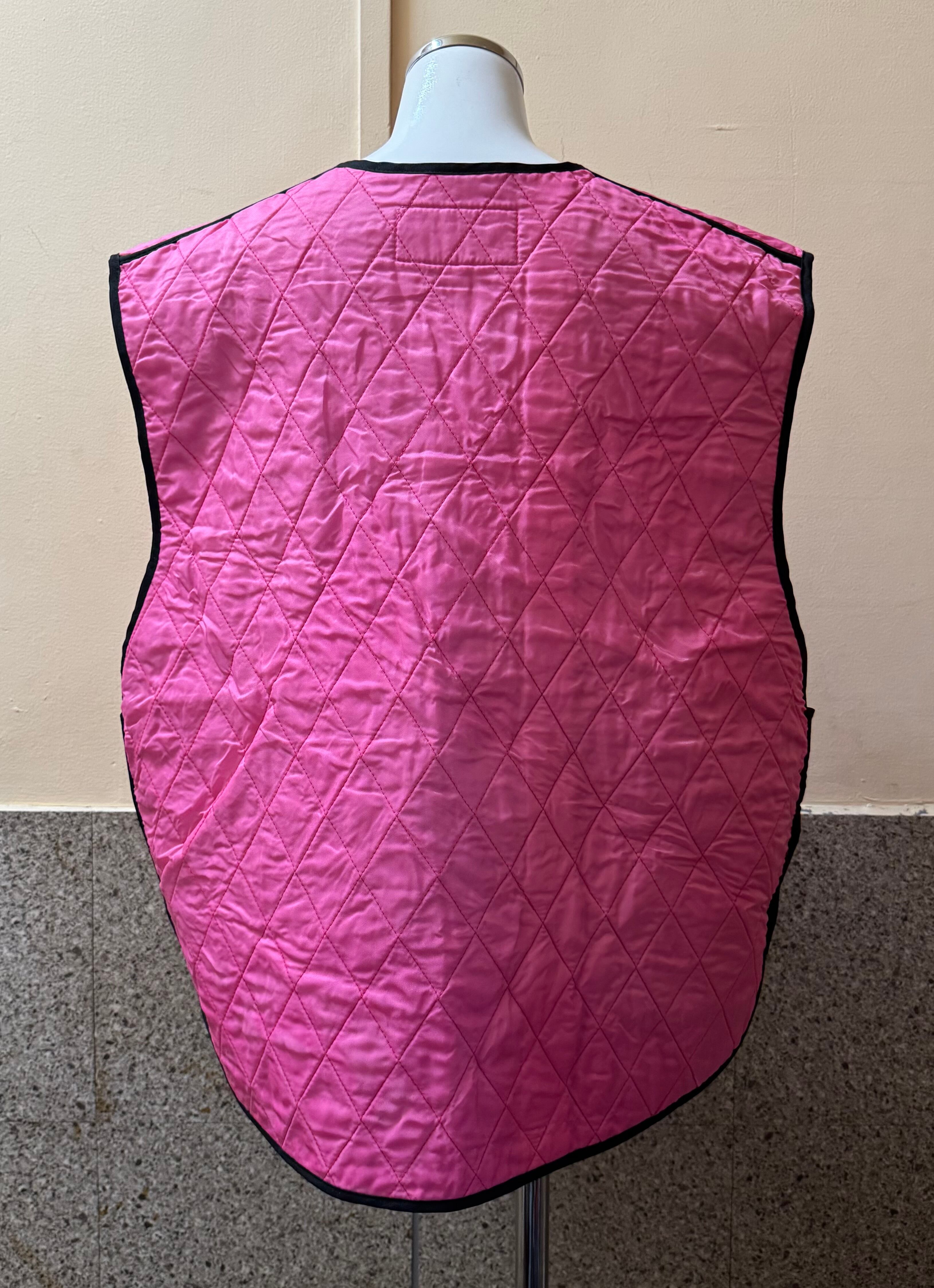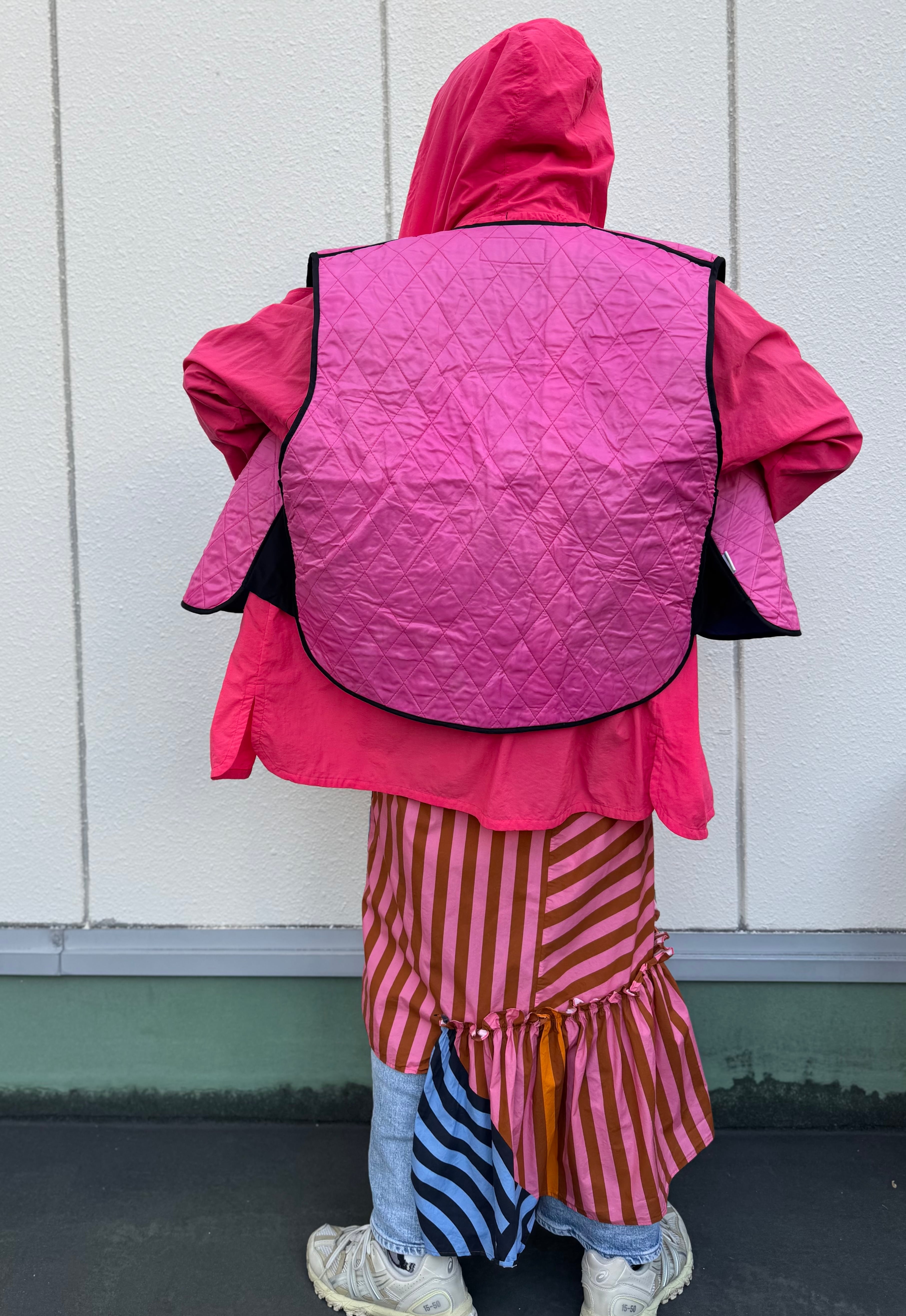 どんなコーディネートに取り入れようか、想像が沸いてしまうピンクのキルティングベスト。