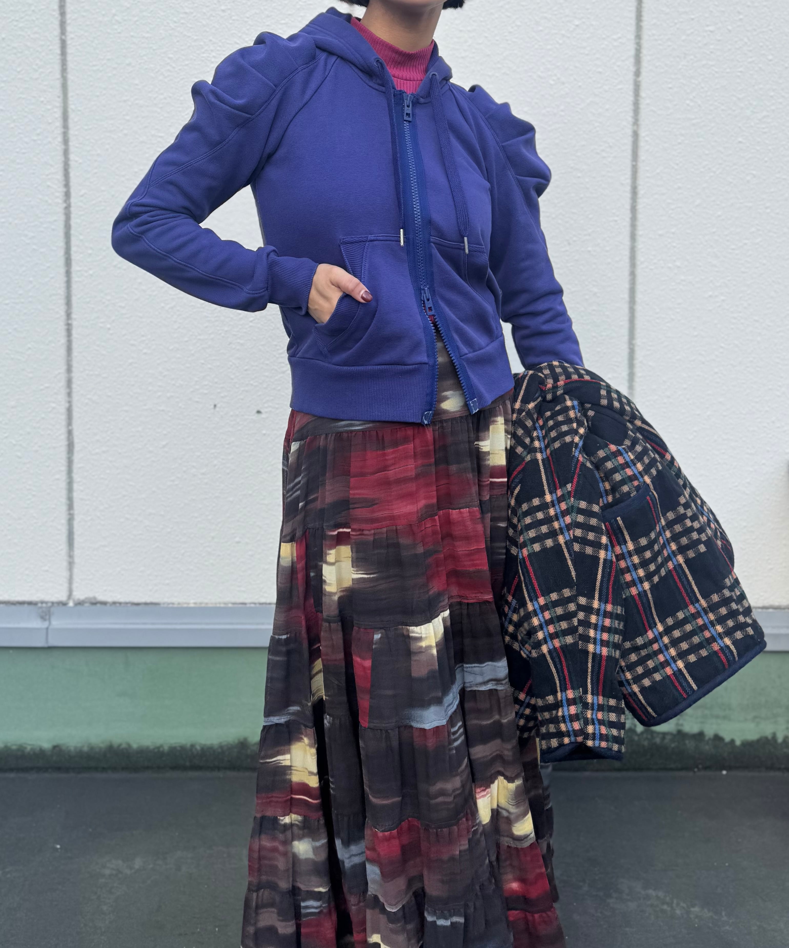 肩の部分のデザインが特徴的ですが、着用すると意外と身体に馴染むようなデザインです。