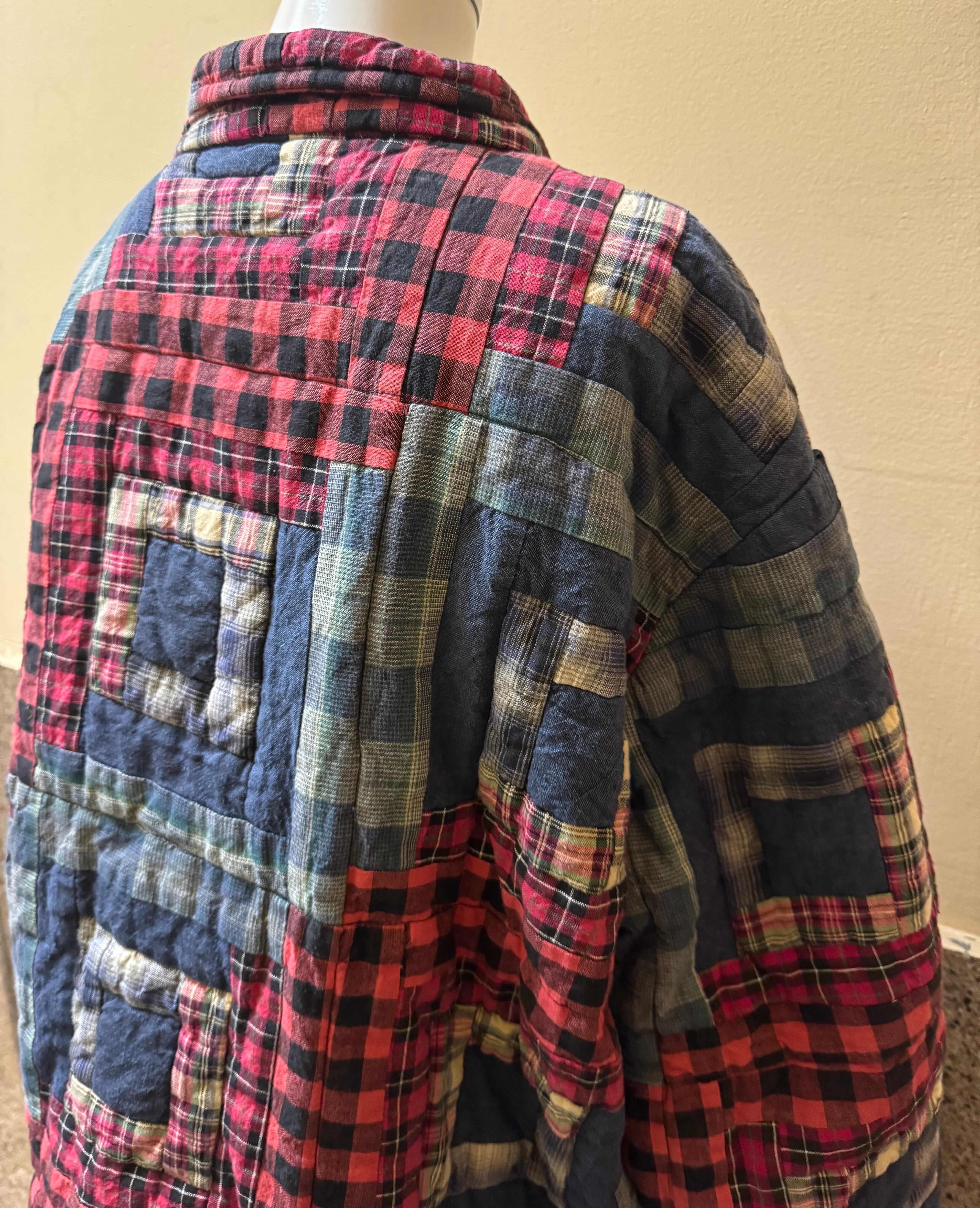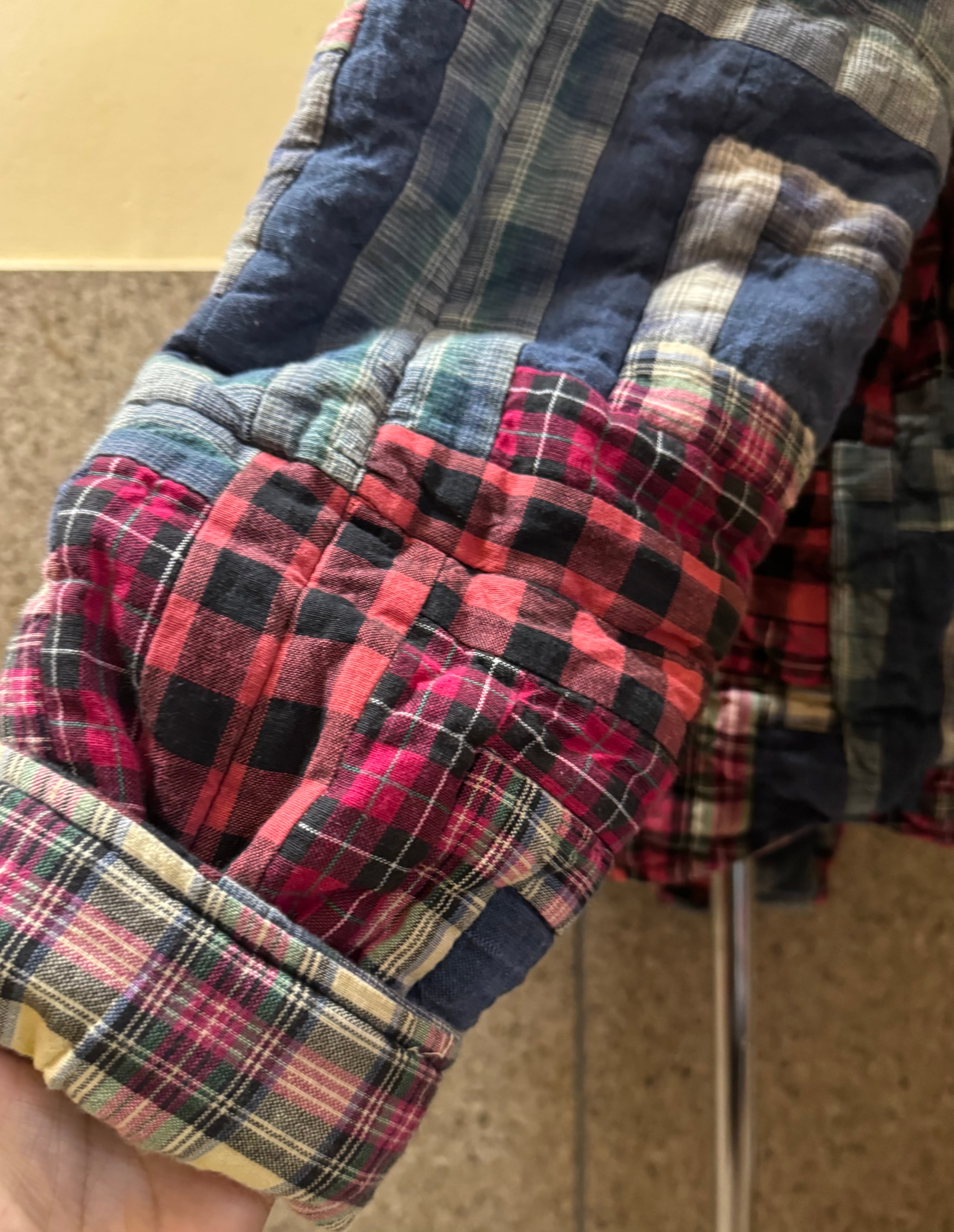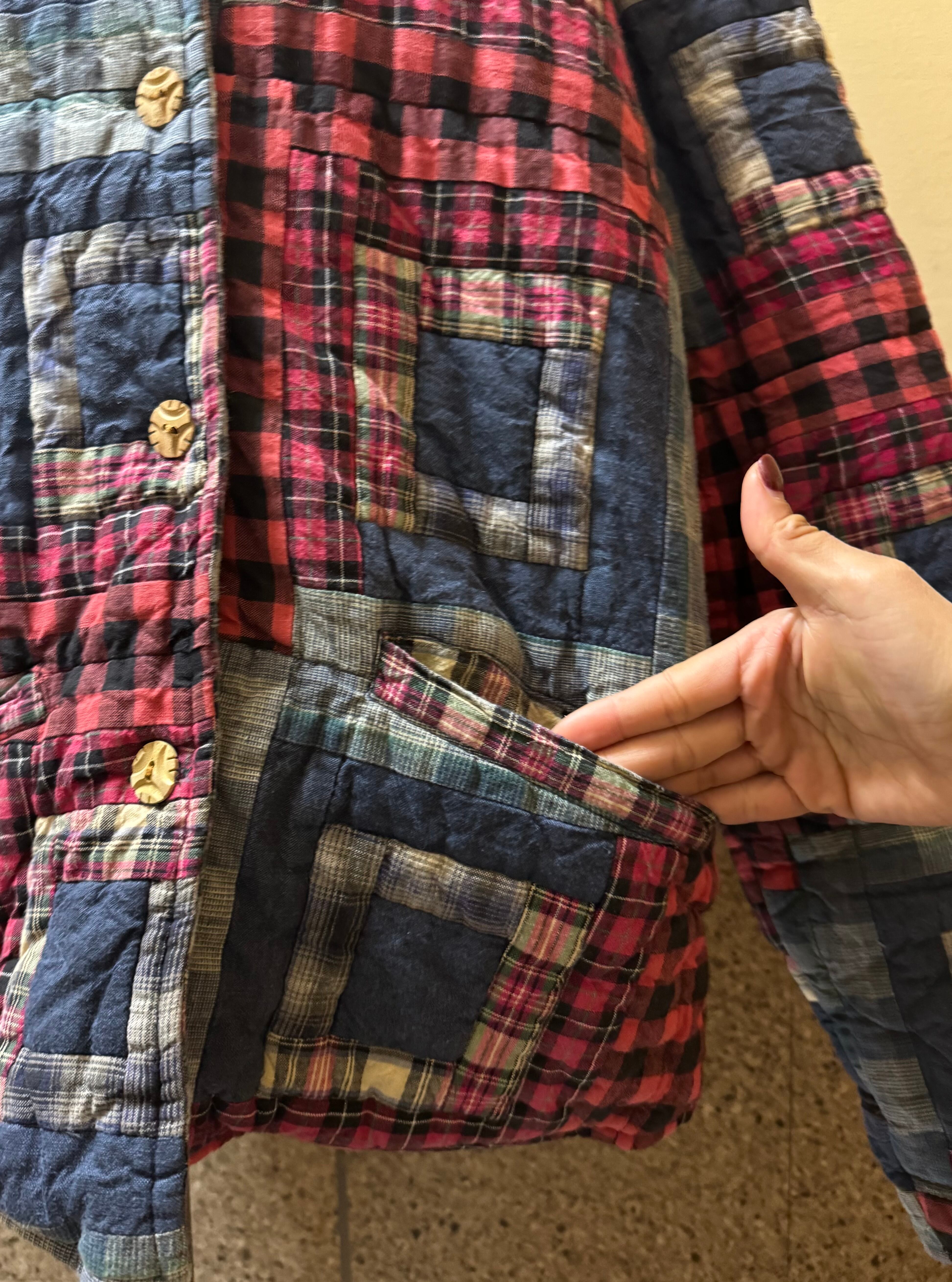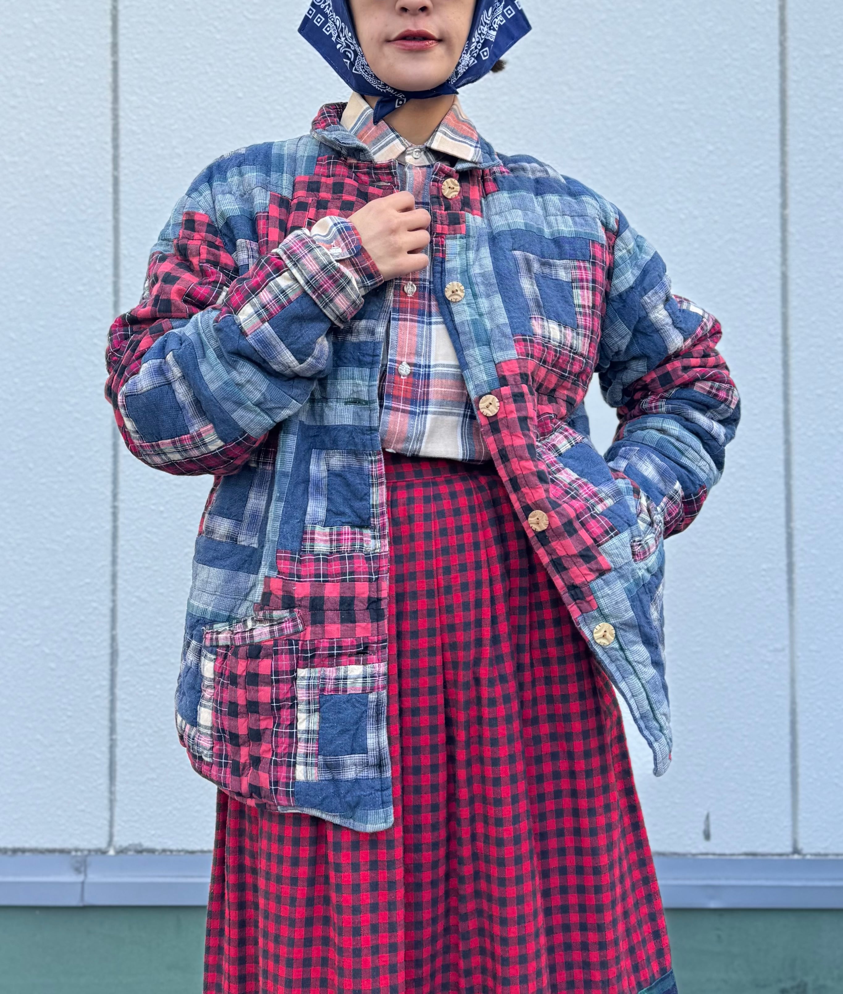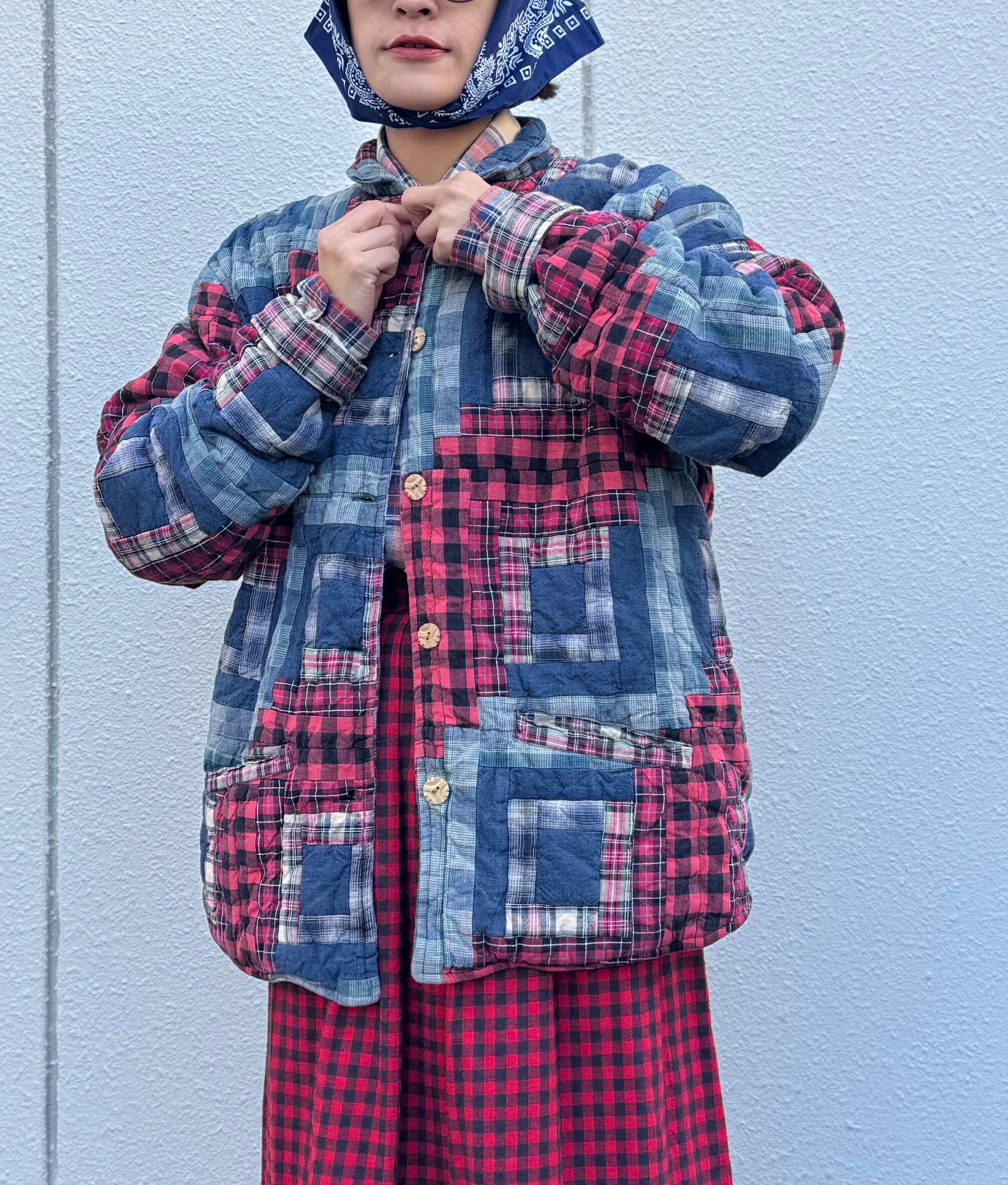 表はチェック柄のパッチワーク、裏はチェック柄のリバーシブルな中綿ジャケット