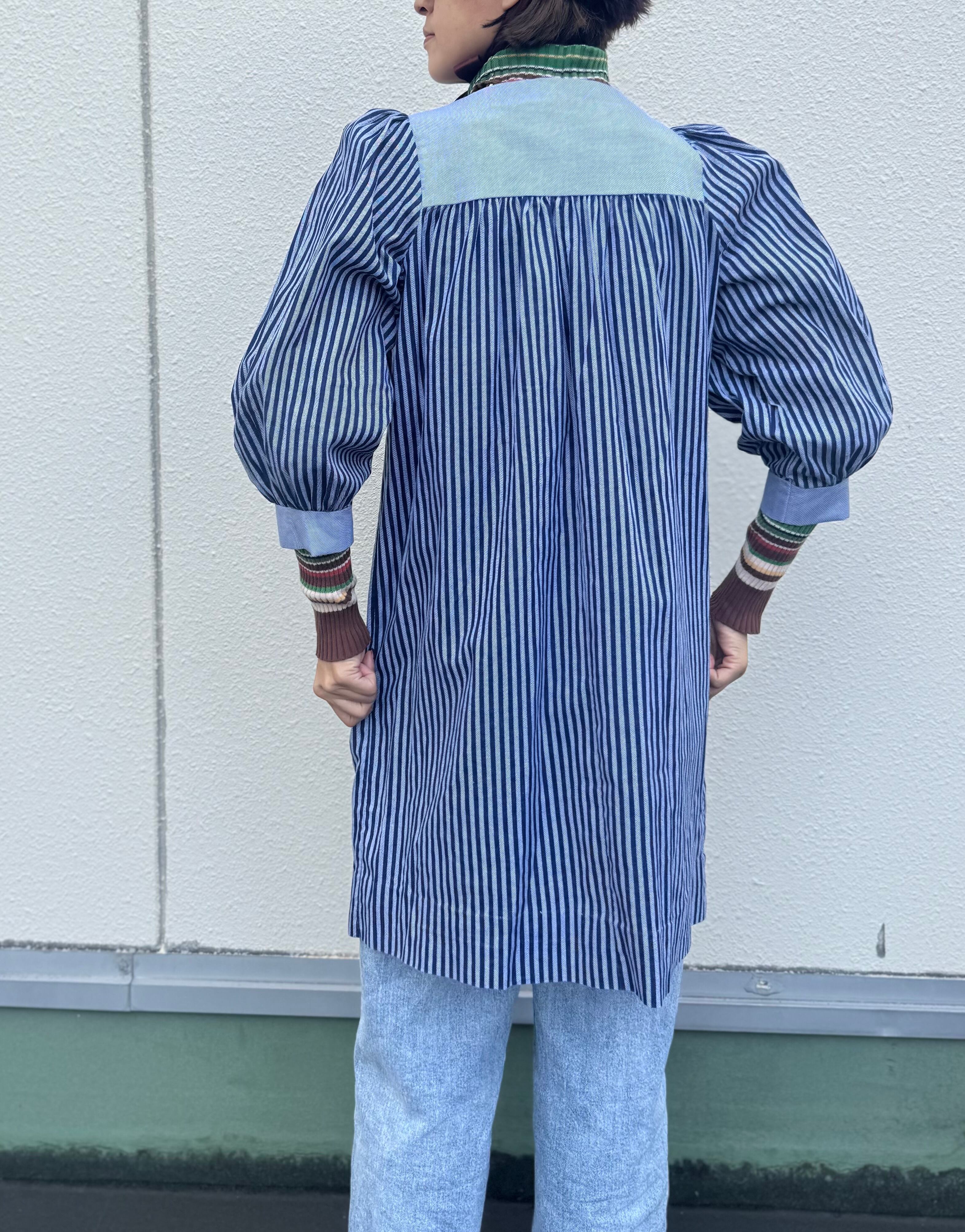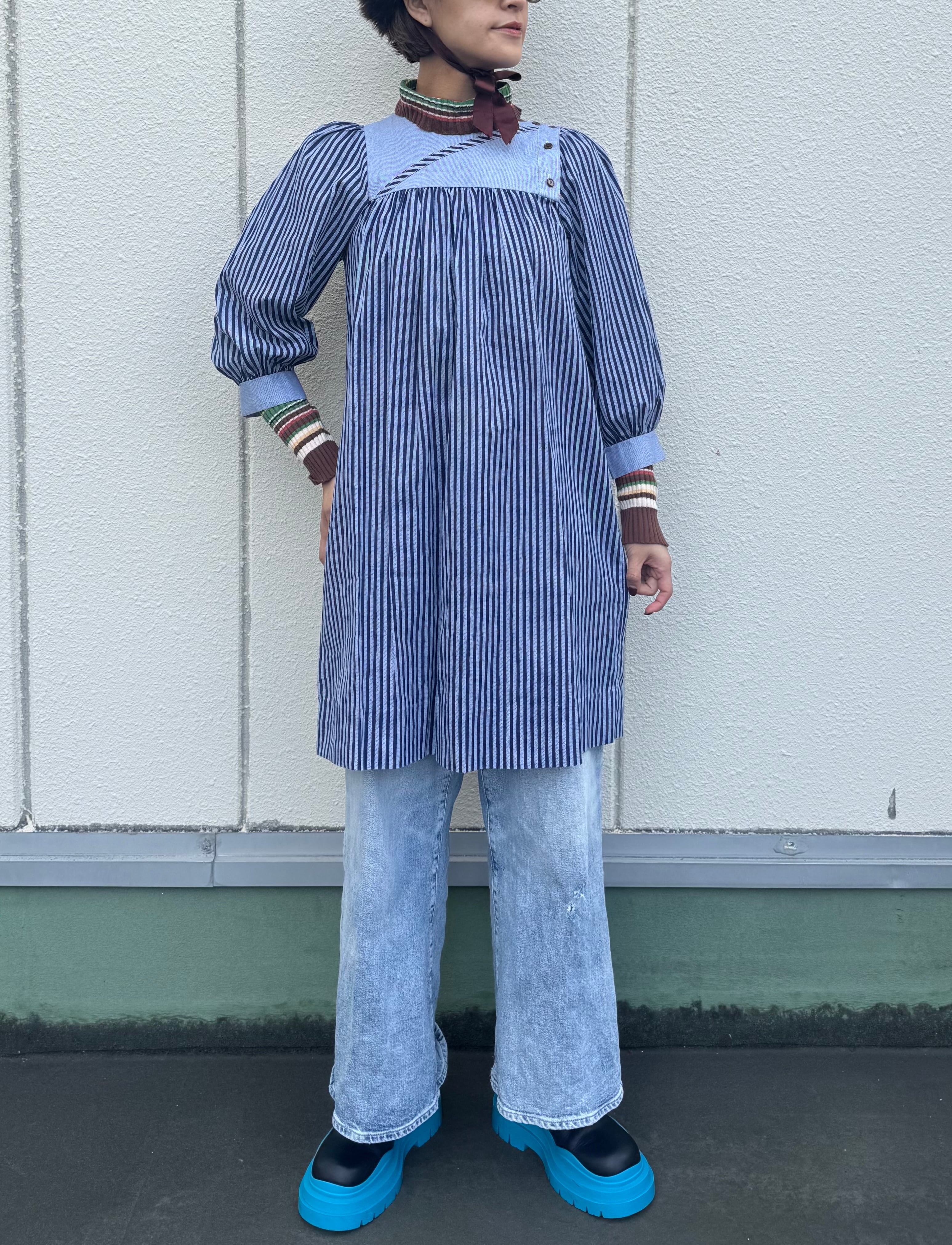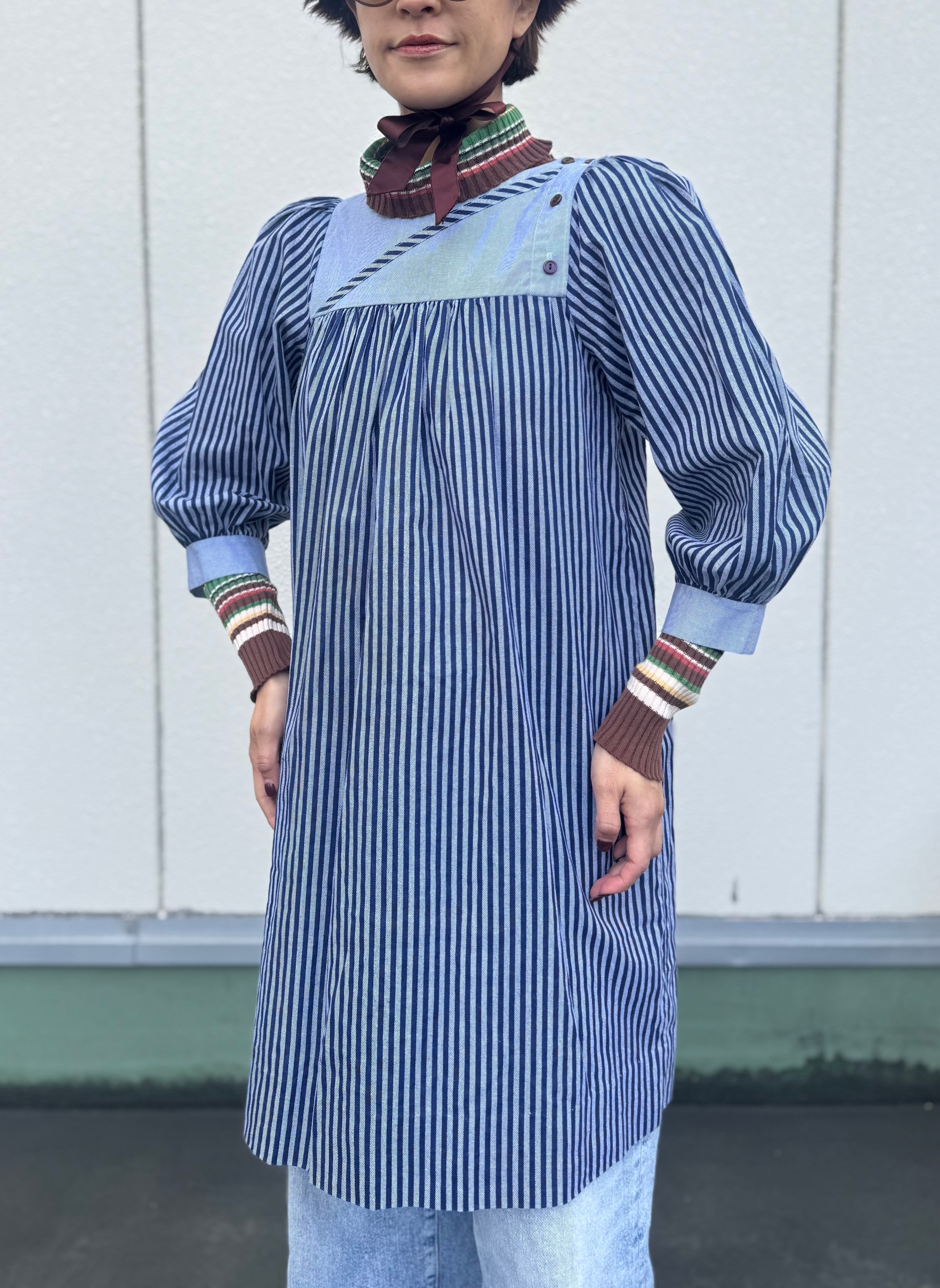 スモックのようなデザインのストライプワンピース