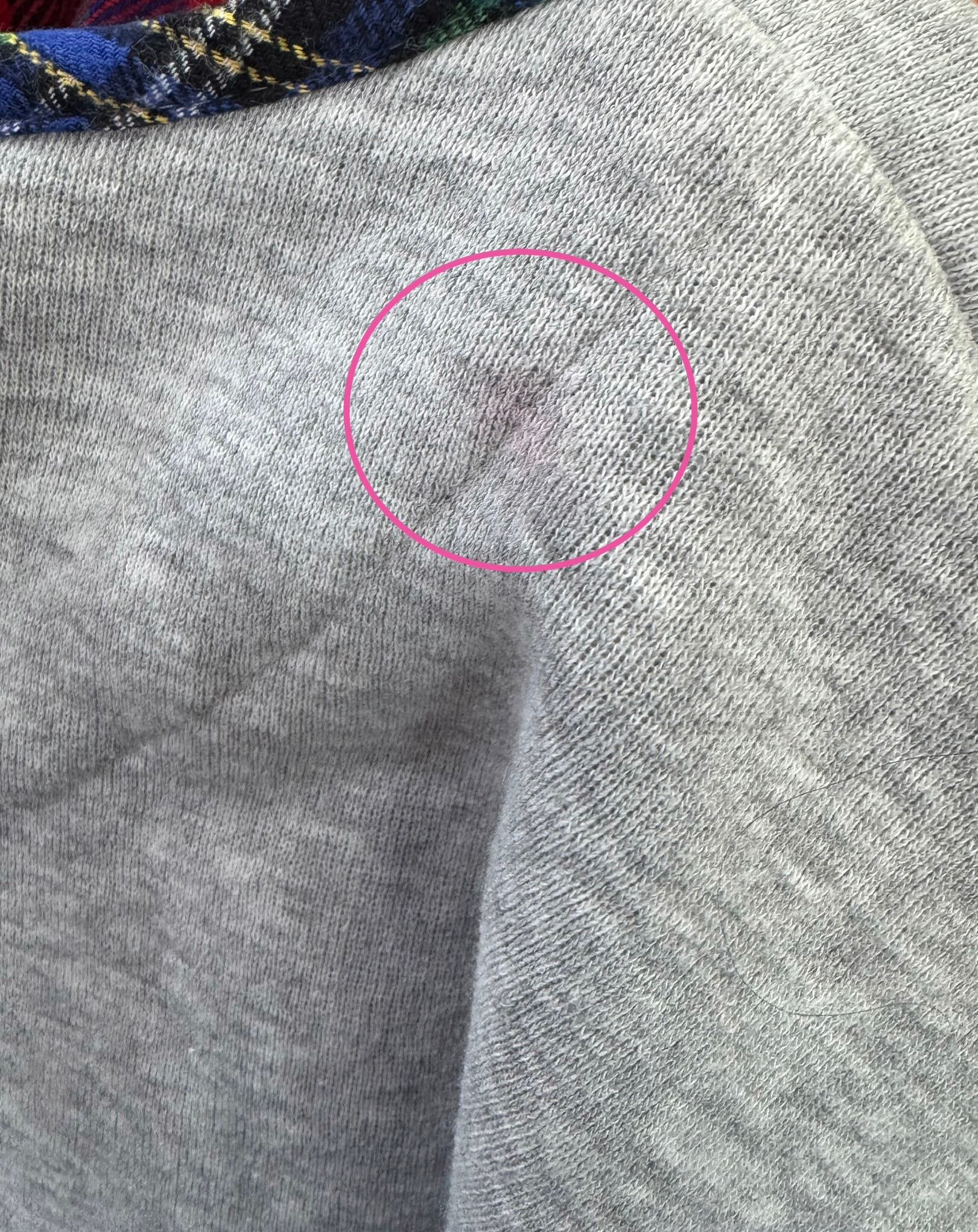 目立たない程度ですが、肩部分にうっすら赤みがかったシミがあります(画像参照)