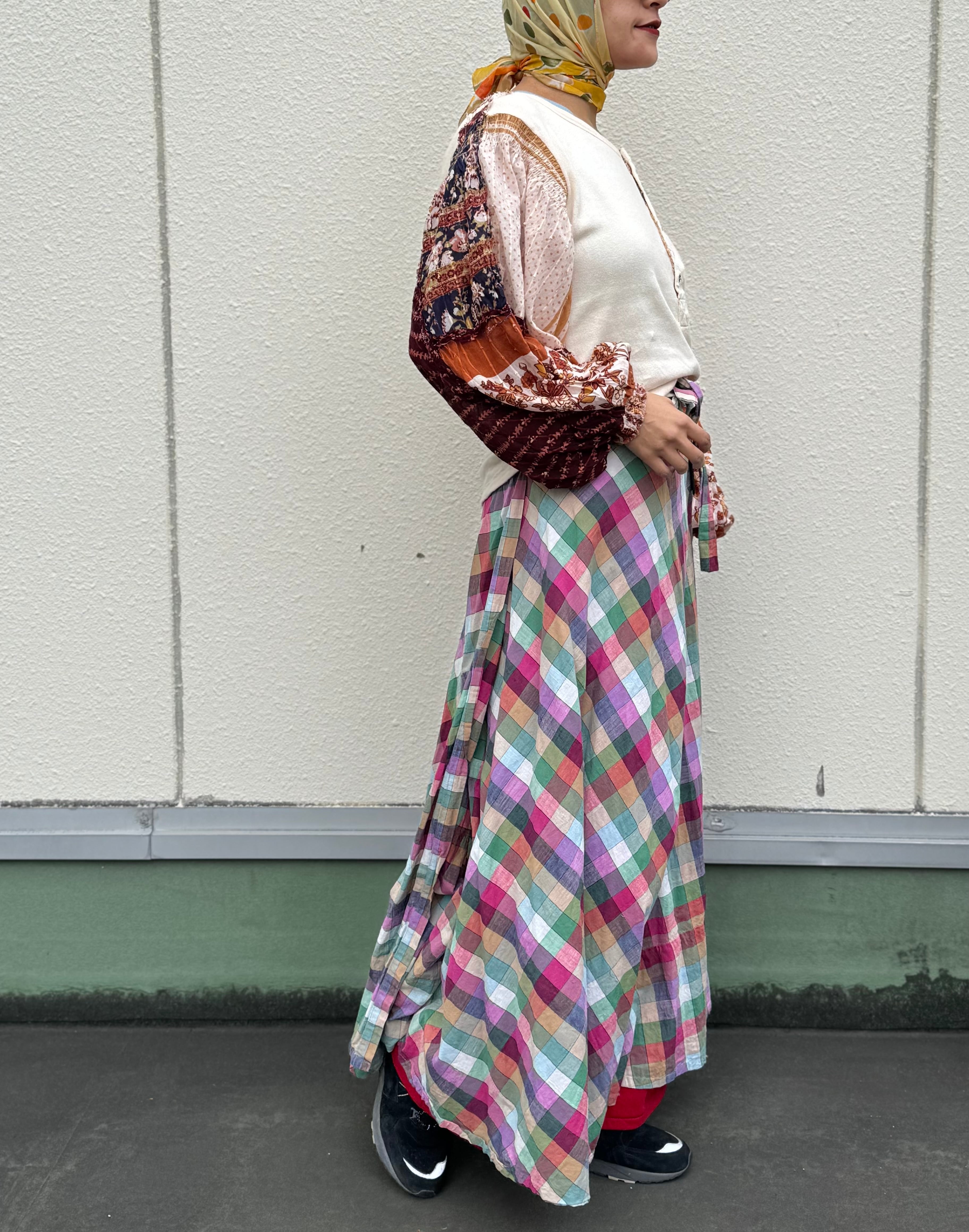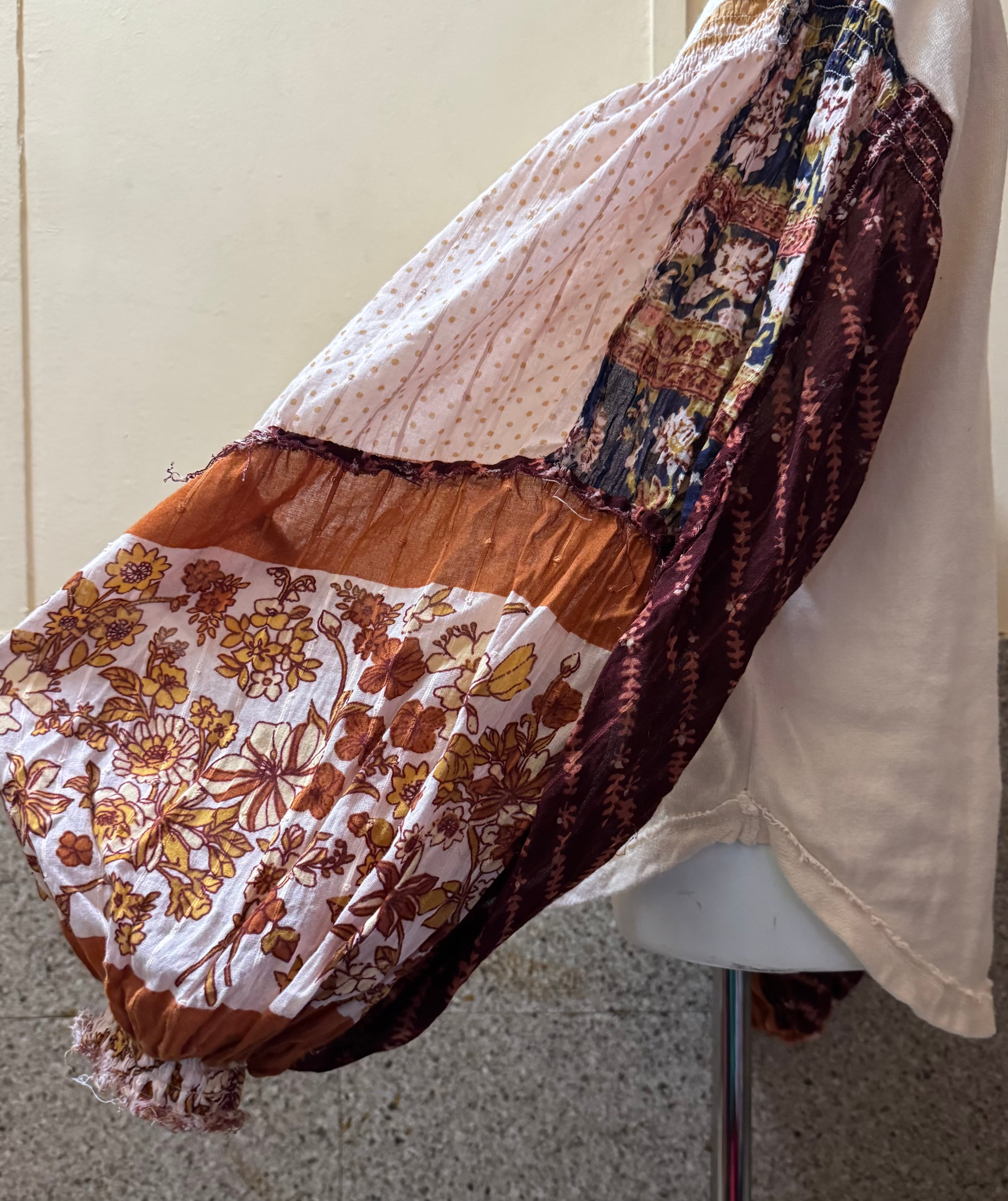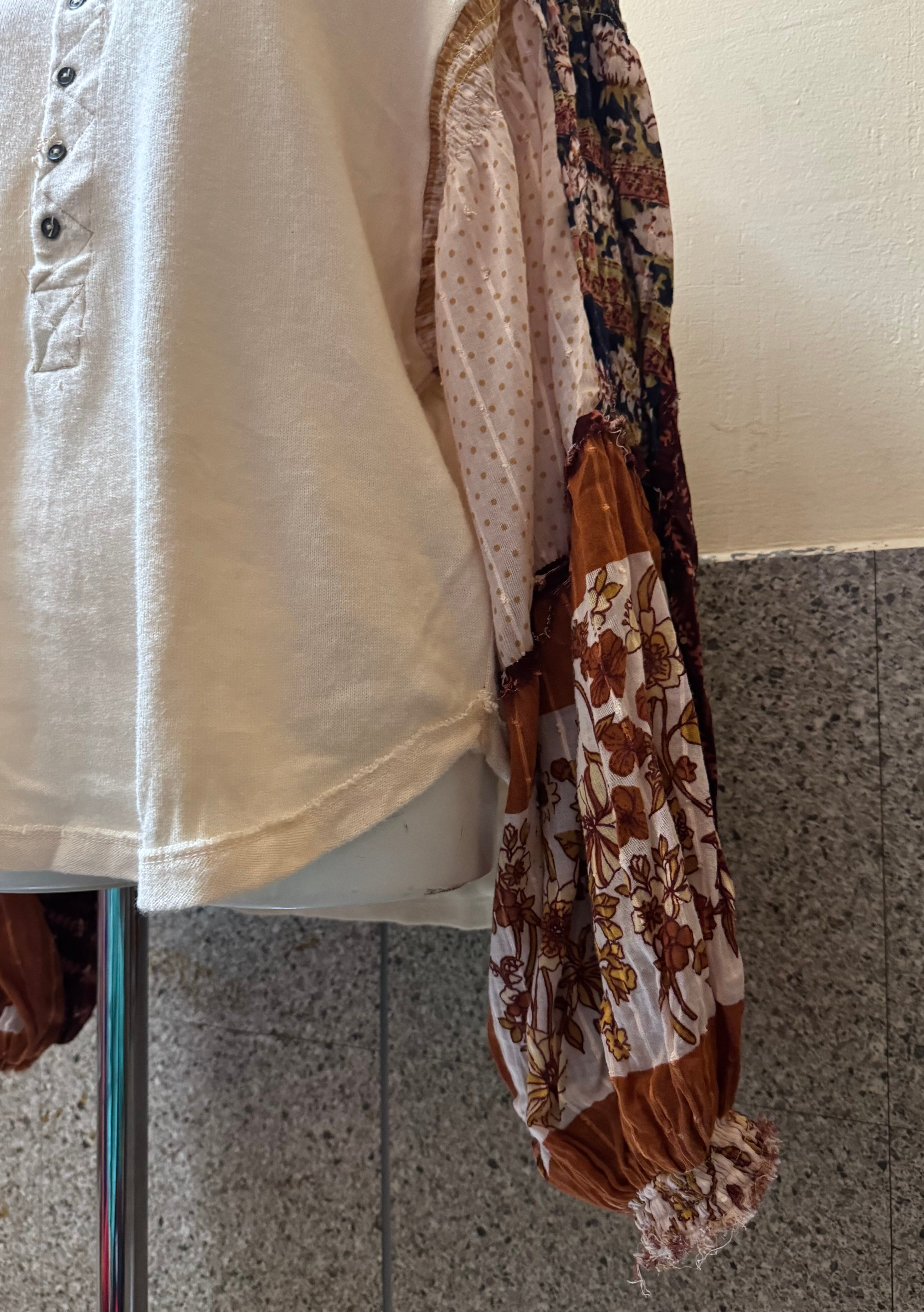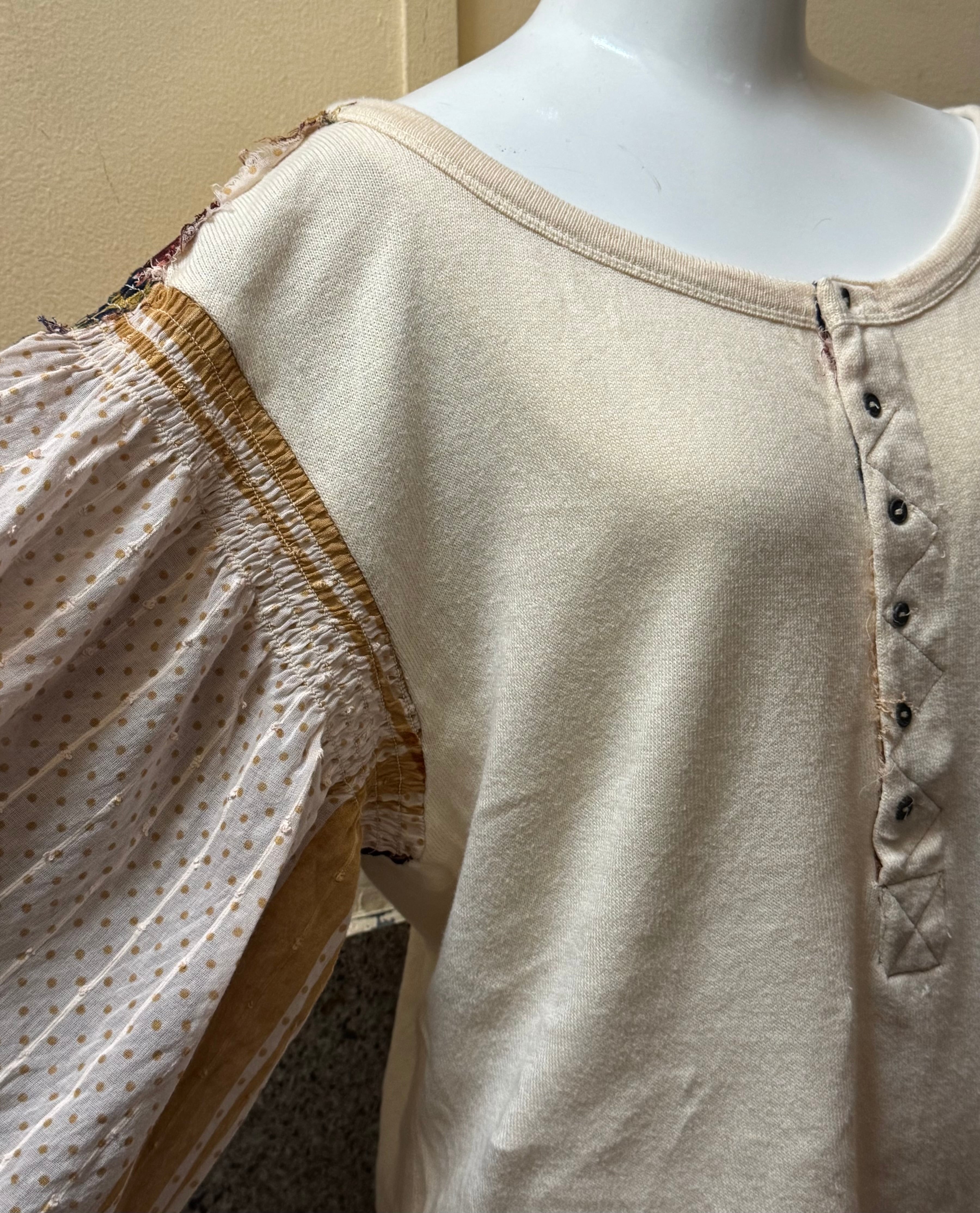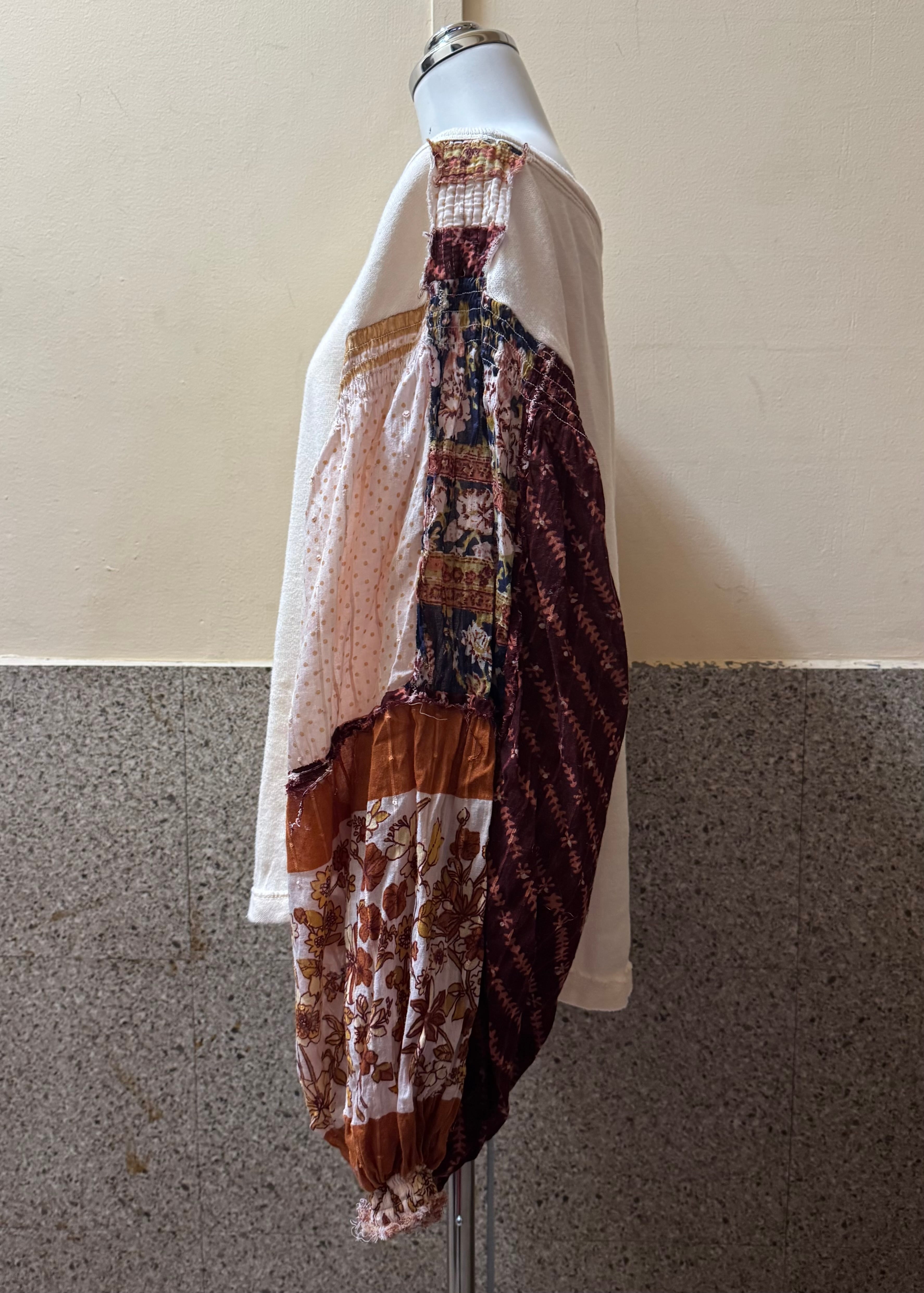 ボディは軽くて柔らかいカットソー袖は透け感のあるパッチワークのデザイン。
