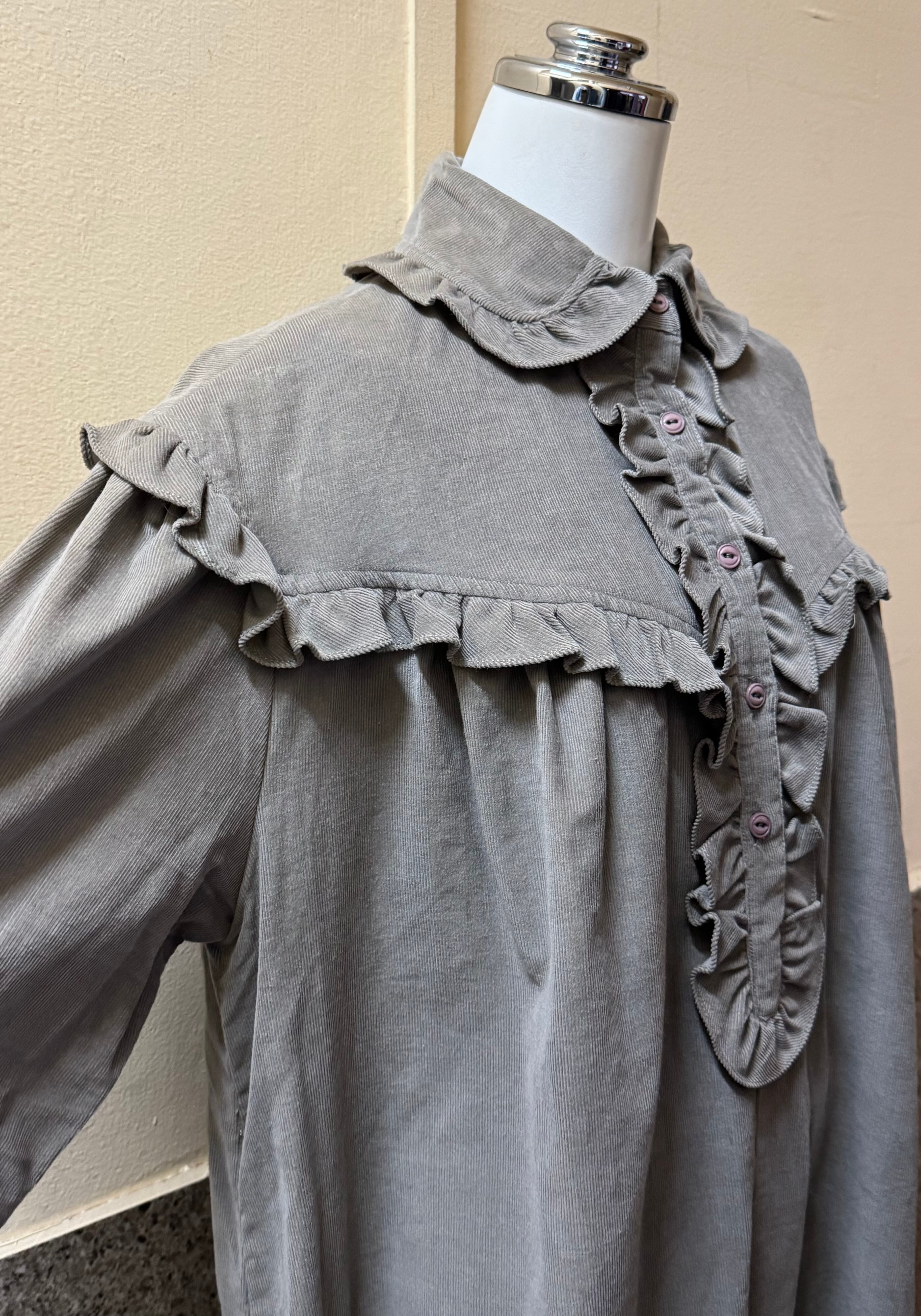 フリルデザインが素敵なコーデュロイのロングワンピース