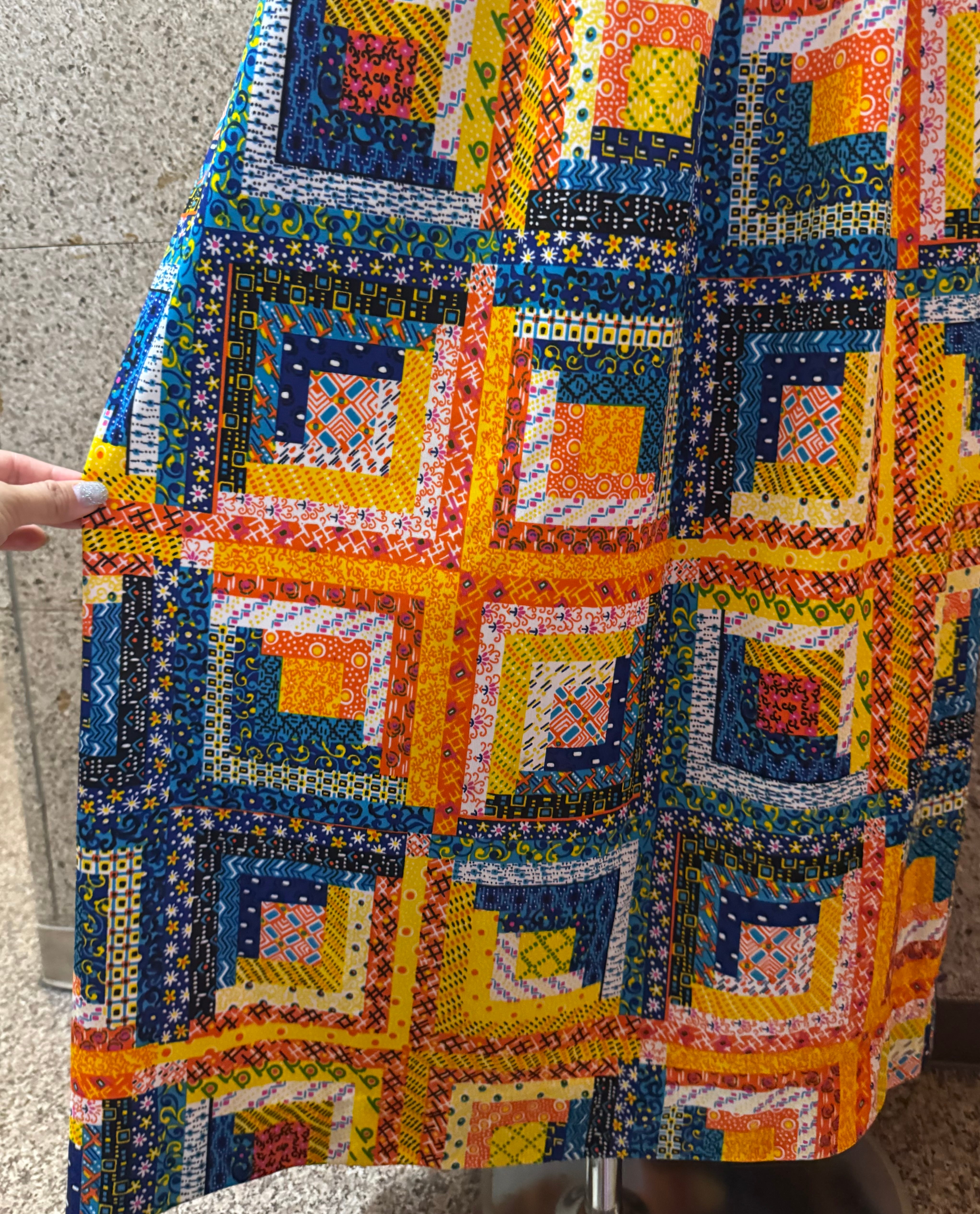 パッチワーク風テキスタイルのワンピース